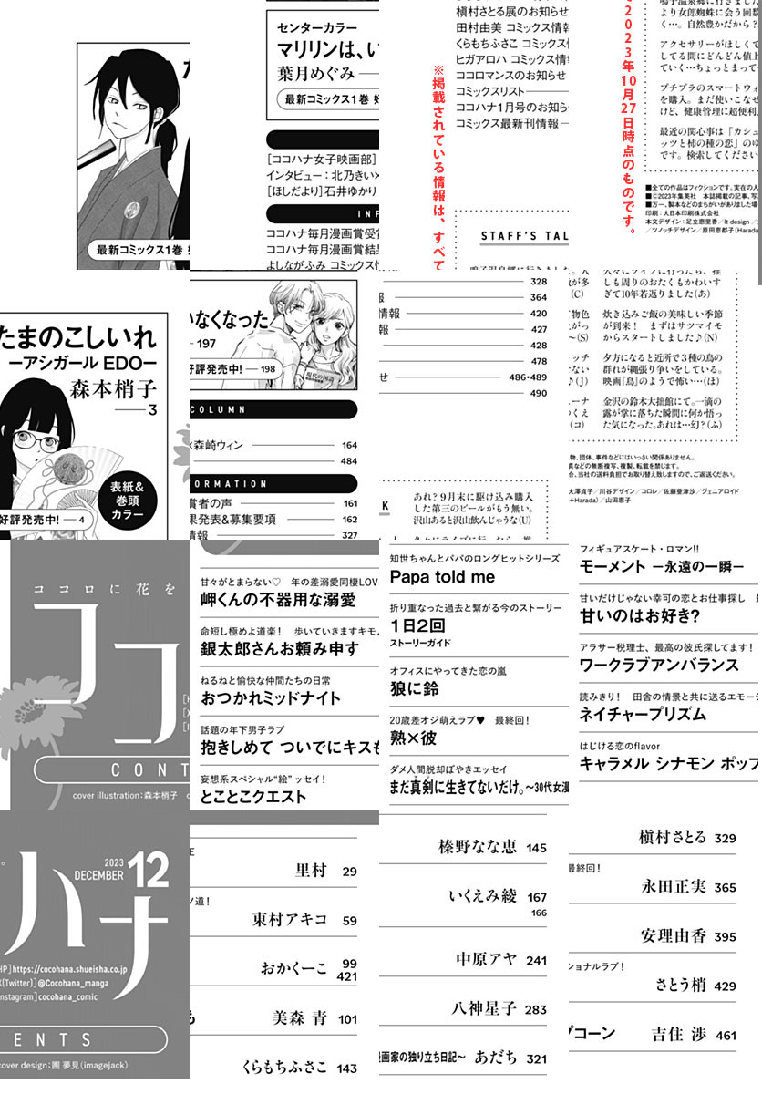 ★待望のコミックス1巻発売!! 表紙&巻頭カラー 森本梢子「たまのこしいれ ―アシガールEDO―」 ★最新コミックス1巻発売記念! 麗しのセンターカラー 葉月めぐみ「マリリンは、いなくなった」 ★甘いだけじゃない恋、感動の最終回! 永田正実「甘いのはお好き?」 ★20歳差オジ萌えラブ完結! 八神星子「熟×彼」 ★フレッシュ読みきり32P さとう梢「ネイチャープリズム」 ★里村「岬くんの不器用な溺愛」 ★東村アキコ「銀太郎さんお頼み申す」 ★おかくーこ「おつかれミッドナイト」 ★美森青「抱きしめて ついでにキスも」 ★くらもちふさこ「とことこクエスト」 ★榛野なな恵「Papa told me」 ★いくえみ綾「1日2回」 ★中原アヤ「狼に鈴」 ★あだち「まだ真剣に生きてないだけ。」 ★槇村さとる「モーメント 永遠の一瞬」 ★安理由香「ワークラブアンバランス」 ★吉住渉「キャラメル シナモン ポップコーン」 ★石井ゆかり「ほしだより」 ※紙版に掲載されている作品・記事が、都合により電子版では掲載がない場合があります。