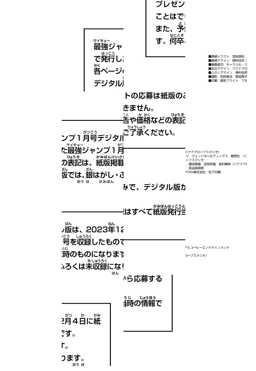 ※デジタル版「最強ジャンプ」は紙版の同号より未掲載のコンテンツがございます。/※デジタル版には紙版の付録は付属しません。あらかじめご了承ください。/「最強ジャンプ 2024年1月号」、紙と同時に配信!/【巻頭カラー】『キメツ学園!』(帆上夏希)/【センターカラー】『スーパードラゴンボールヒーローズ メテオミッション!』(ながやま由貴)、『僕のヒーローアカデミア チームアップミッション』(あきやま陽光)、『怪奇空間ゾゾゾゾーン』(原作:小林拙太 作画:仲島歩)、『モンスターストライク バーストファンタジスタ』(八守りょう)/【特別読切】『喜甲斐田先生はサイボーグ』(桂木イキル)/ほか、盛りだくさんのまんが・最新ゲーム・アニメ・ホビー情報などを掲載!!