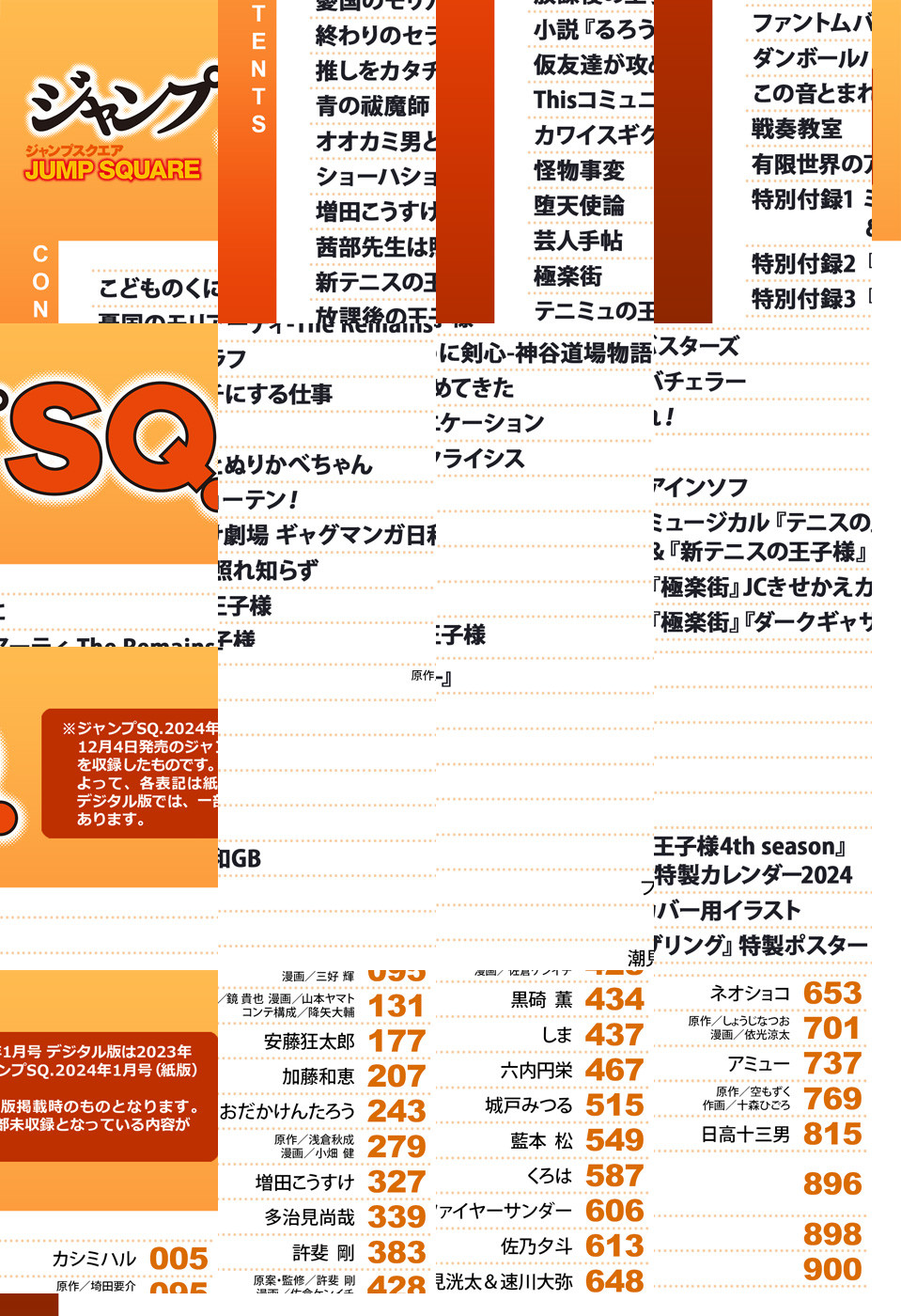※「ジャンプSQ.」デジタル版には、紙版の付録は付属しません。ご了承ください。/「ジャンプSQ. 2024年1月号」、紙と同時に配信!/【表紙】『新テニスの王子様』(許斐剛)/【新連載&巻頭カラー】『こどものくに』(カシミハル)/【センターカラー】『推しをカタチにする仕事』(安藤狂太郎)、『茜部先生は照れ知らず』(多治見尚哉)、『Thisコミュニケーション』(六内円栄)、『怪物事変』(藍本松)、『ファントムバスターズ』(ネオショコ)/【特別読切】『仮友達が攻めてきた』(しま)/【特別付録】ミュージカル『テニスの王子様 4th season』&『新テニスの王子様』特製カレンダー2024、『極楽街』JCきせかえカバー、『極楽街』『ダークギャザリング』特製ポスター(デジタル版はイラストとして巻末に収録)/ほか、14作品を収録!