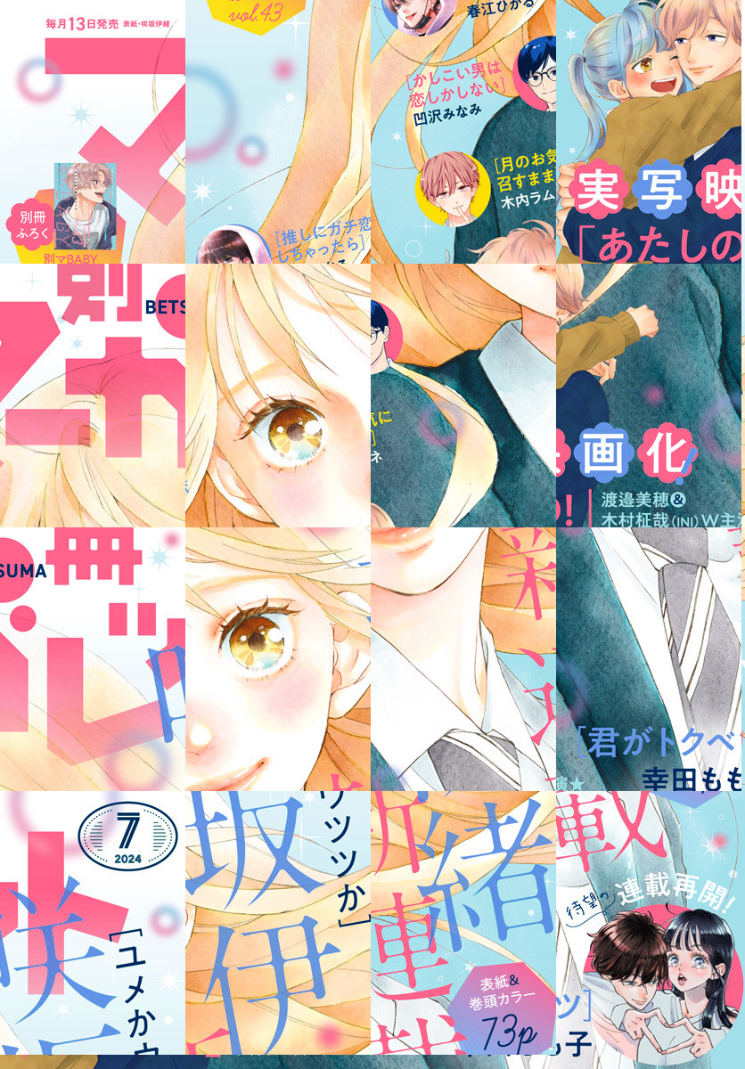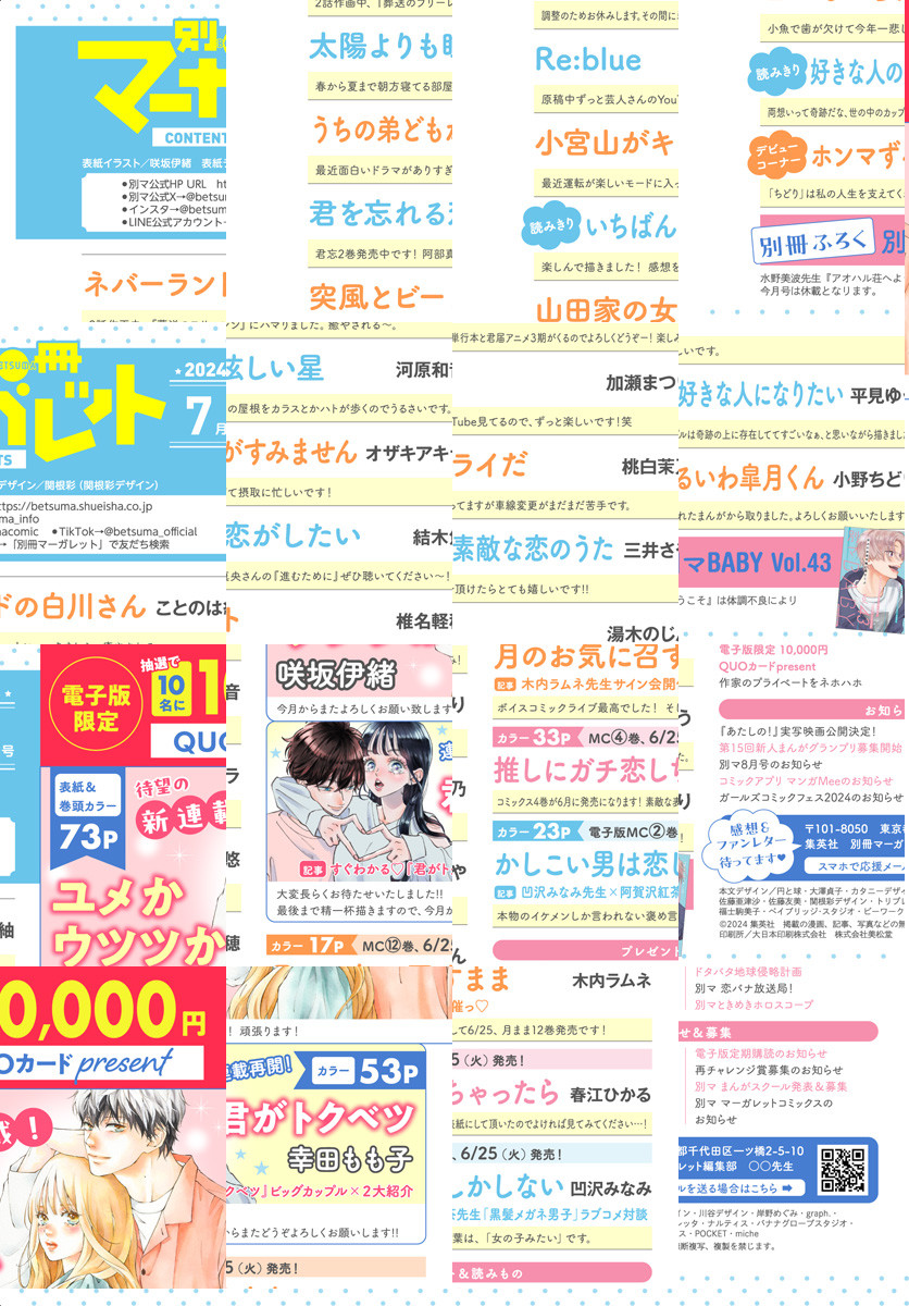 ★新連載 表紙&巻頭カラー 咲坂伊緒「ユメかウツツか」 ★巻中カラー 木内ラムネ「月のお気に召すまま」 ★巻中カラー 幸田もも子「君がトクベツ」 ★巻中カラー 春江ひかる「推しにガチ恋しちゃったら」 ★巻中カラー 凹沢みなみ「かしこい男は恋しかしない」 ★ことのは紬「ネバーランドの白川さん」 ★河原和音「太陽よりも眩しい星」 ★オザキアキラ「うちの弟どもがすみません」 ★結木悠「君を忘れる恋がしたい」 ★椎名軽穂「突風とビート」 ★加瀬まつり「Re:blue」 ★桃白茉乃「小宮山がキライだ」 ★湯木のじん「山田家の女」 ★読みきり 三井さや「いちばん素敵な恋のうた」 ★読みきり 平見ゆう「好きな人の好きな人になりたい」 ★デビュー 小野ちどり「ホンマずるいわ皐月くん」 ◇別冊ふろく[別マ BABY vol.43]…双海芽生、みけこさき、斜線堂有紀・しみずりさ、一森みらい、月茂陽生、紗織、浅川あめ、佑紀友恵 ※紙版に掲載されている記事は、電子版では掲載していない場合があります。