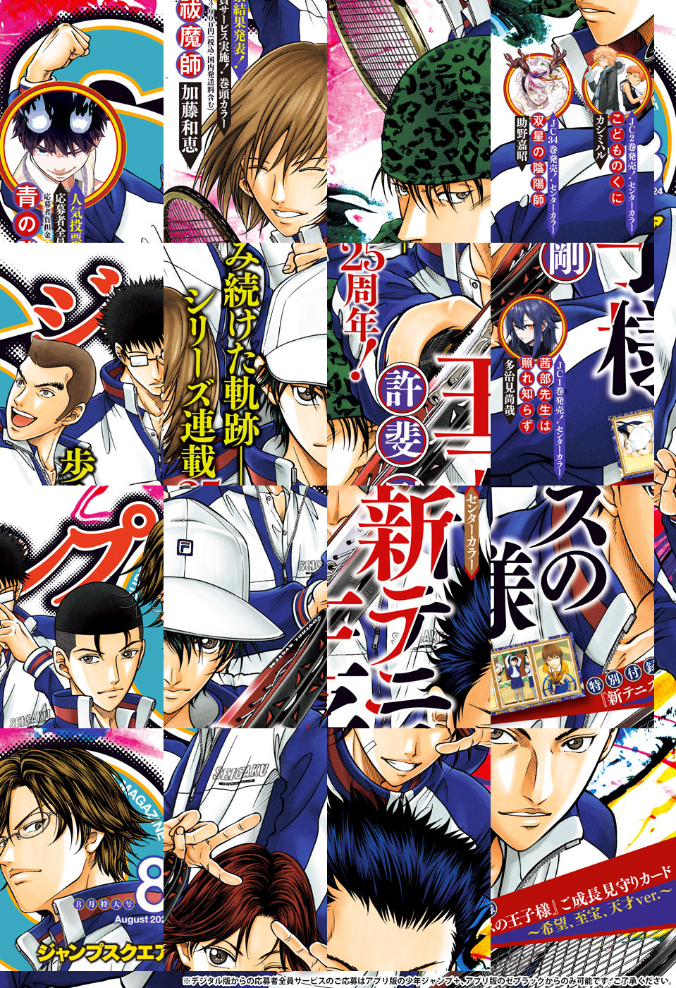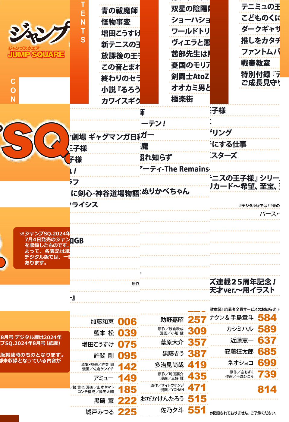 ※「ジャンプSQ.」デジタル版には、紙版の付録は付属しません。応募者全員サービスのご応募はアプリ版の少年ジャンプ+、アプリ版のゼブラックからのみ可能です。ご了承ください。/「ジャンプSQ. 2024年8月号」、紙と同時に配信!/【表紙&センターカラー】『新テニスの王子様』(許斐剛)/【巻頭カラー】『青の祓魔師』(加藤和恵)/【センターカラー】『双星の陰陽師』(助野嘉昭)、『茜部先生は照れ知らず』(多治見尚哉)、『こどものくに』(カシミハル)/【特別読切】『ヴィエラと悪魔』(黒藤きう)/【特別付録】『テニスの王子様』シリーズ連載25周年記念!ご成長見守りカード~希望、至宝、天才ver.~(デジタル版はイラストとして巻末に収録)/ほか、16品を収録!