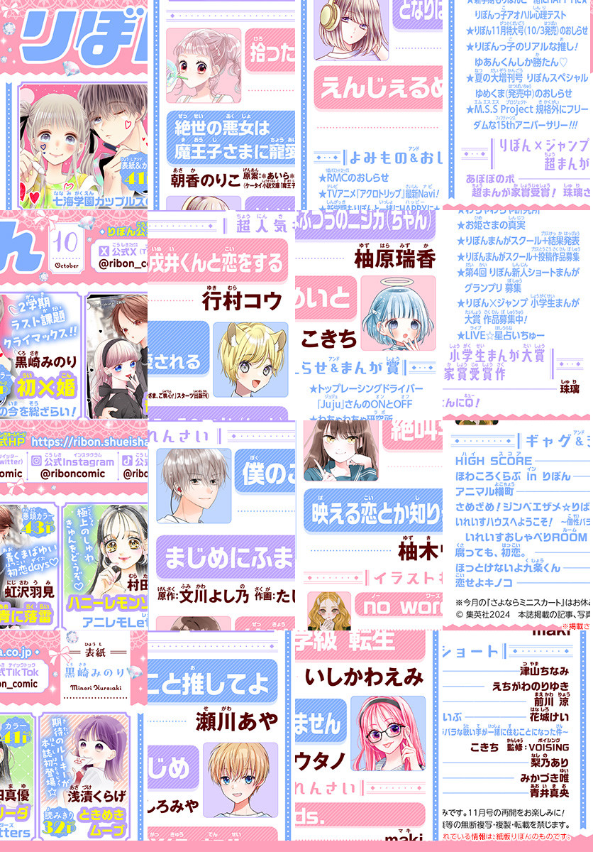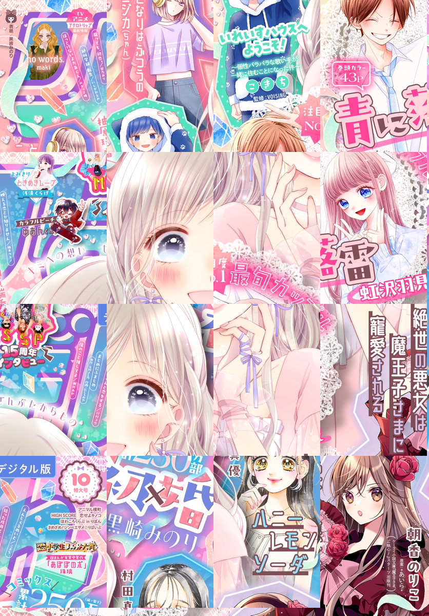 ★コミックス累計250万部突破の大ヒットAI婚活ラブ! 黒崎みのり「初×婚」 ★ピュア度1000%の初恋に話題集中! 巻頭カラー 虹沢羽見「青に落雷」 ★TVアニメ化決定! 人気もきゅんもNo.1! 村田真優「ハニーレモンソーダ」 ★さっそく大人気! 天使界隈ファンタジー こきち「えんじぇるめいと」 ★圧倒的人気の溺愛ファンタジー! 朝香のりこ 原案:*あいら*「絶世の悪女は魔王子さまに寵愛される」 ★大人気の歌い手集団をコミカライズ! こきち 監修:VOISING「いれいすハウスへようこそ!~個性バラバラな歌い手が一緒に住むことになった件~」 ★同級生同士の秘密の同居ライフ! 行村コウ「拾った戌井くんと恋をする」 ★注目ルーキーのハートフル読みきり 浅漬くらげ「ときめきムーブ」