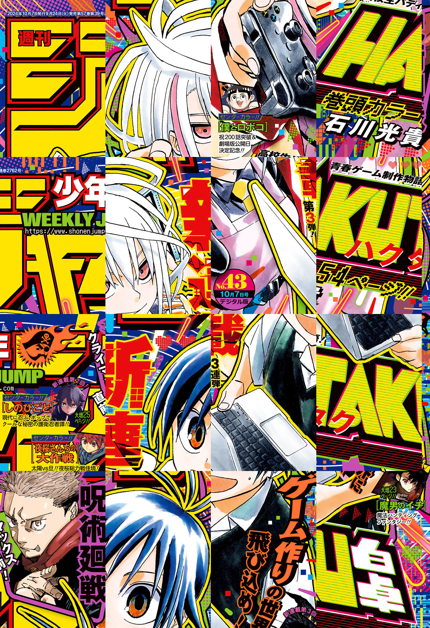 【記事ページ】も毎号収録!/光輝燦然☆ジャンプミラクル!猛者が集いし秋の新連載3連弾第3弾!高校生バディ青春ゲーム制作物語 表紙&巻頭カラー54ページ!!『白卓 HAKUTAKU』/現代に忍ぶ、ポップでクールな秘密の護衛忍者譚!!新連載第2回センターカラー大増25ページ!!『しのびごと』/祝200話突破&劇場版公開日決定記念センターカラー!『僕とロボコ』/太陽VS旦!!夜桜総力戦佳境センターカラー!!『夜桜さんちの大作戦』/※デジタル版では、綴じ込み付録・シリアルコードなど一部未収録となっている内容があります。※収録されている懸賞などは紙版の企画であり、デジタル版では一部ご応募頂けないものがございます。