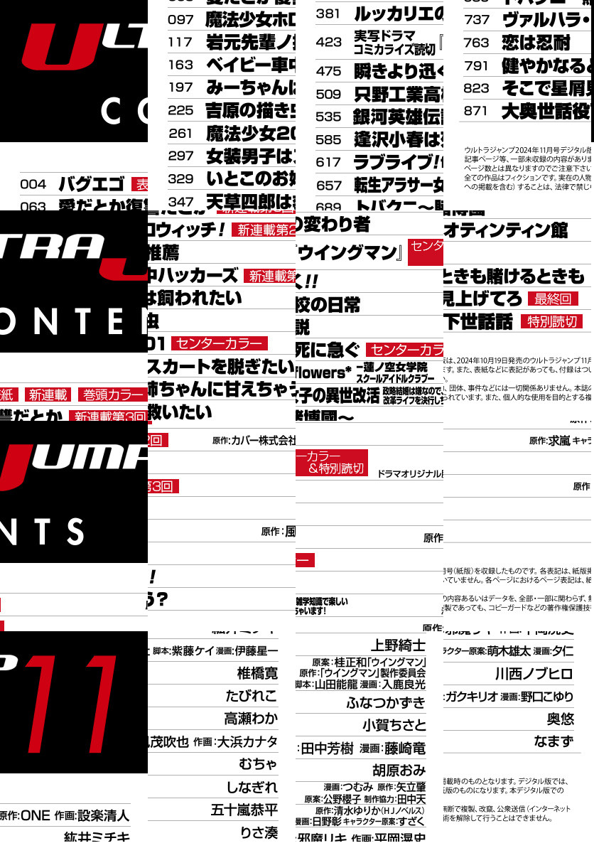 「ウルトラジャンプ 2024年11月号」、紙と同時に配信!/【表紙&新連載&巻頭カラー】『バグエゴ』(原作:ONE 作画:設楽清人)/【センターカラー】『魔法少女201』(むちゃ)、『逢沢小春は死に急ぐ』(胡原おみ)/【センターカラー&特別読切】実写ドラマコミカライズ読切『ウイングマン』(原案:桂正和「ウイングマン」 原作:「ウイングマン」製作委員会 ドラマオリジナル脚本:山田能龍 漫画:入鹿良光)/【最終回】『そこで星屑見上げてろ』(奥悠)/【特別読切】『大奥世話役下世話話』(なまず)/ほか、19作品を掲載!