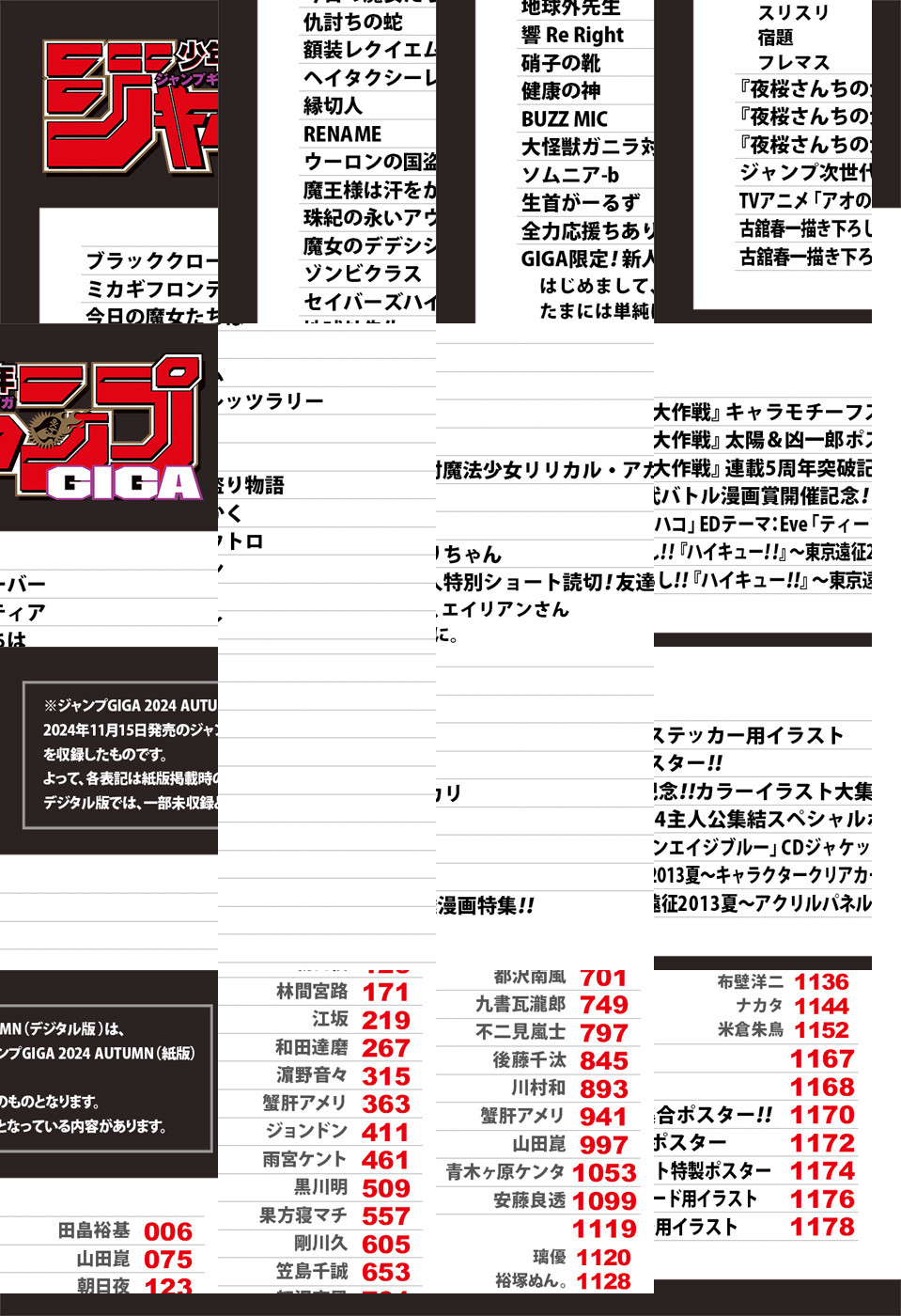※本商品の「ジャンプGIGA」デジタル版には、紙版の付録は付属しません。また、紙版購入者限定通販を購入することもできません。ご了承ください。/週刊少年ジャンプ特別編集増刊「ジャンプGIGA 2024 AUTUMN」、紙と同時に配信!/【巻頭カラー】『ブラッククローバー』(田畠裕基)/【センターカラー】『魔王様は汗をかく』(雨宮ケント)/【付録】『夜桜さんちの大作戦』太陽&凶一郎ポスター!!、『夜桜さんちの大作戦』キャラモチーフステッカー、『夜桜さんちの大作戦』連載5周年突破記念!!カラーイラスト大集合ポスター!!、古舘春一描き下ろし!!『ハイキュー!!』~東京遠征2013夏~アクリルパネル、古舘春一描き下ろし!!『ハイキュー!!』~東京遠征2013夏~キャラクタークリアカード、ジャンプ次世代バトル漫画賞開催記念!4主人公集結スペシャルポスター、TVアニメ『アオのハコ』EDテーマ:Eve「ティーンエイジブルー」CDジャケット特製ポスター(デジタル版はイラストとして収録)/ほか、多数の新作読切を掲載!
