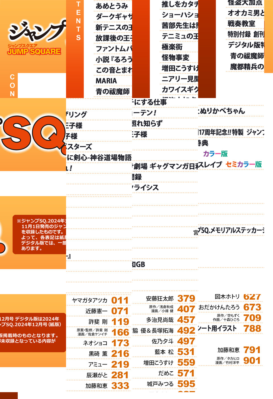 ※「ジャンプSQ.」デジタル版には、紙版の付録は付属しません。ご了承ください。/「ジャンプSQ. 2024年12月号」、紙と同時に配信!/【表紙】『怪物事変』(藍本松)/【新連載&巻頭カラー】『あめとうみ』(ヤマガタアツカ)/【センターカラー】『新テニスの王子様』(許斐剛)、『極楽街』(佐乃夕斗)/【特別読切&センターカラー】『MARIA』(辰瀬がと)、『怪盗大加点』(図木ホトリ)/【特別読切】『ニアリー見聞録』(だめこ)/【特別付録】創刊17周年記念!! 特製 ジャンプSQ.メモリアルステッカーシート(デジタル版はイラストとして巻末に収録)/【デジタル版特典】『青の祓魔師 カラー版』(加藤和恵)、『魔都精兵のスレイブ セミカラー版』(原作:タカヒロ 漫画:竹村洋平)/ほか、12作品を収録!