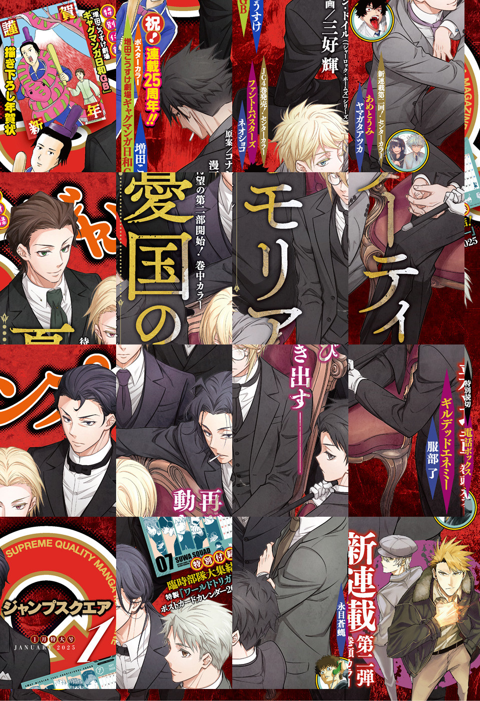 ※「ジャンプSQ.」デジタル版には、紙版の付録は付属しません。ご了承ください。/「ジャンプSQ. 2025年1月号」、紙と同時に配信!/【表紙&巻中カラー】『憂国のモリアーティ』(原案:コナン・ドイル(「シャーロック・ホームズ」シリーズ) 三好輝)/【新連載&巻頭カラー】『ギルデッドエネミー』(服部了)/【ポスターカラー】『増田こうすけ劇場 ギャグマンガ日和GB』(増田こうすけ)/【センターカラー】『あめとうみ』(ヤマガタアツカ)、『ファントムバスターズ』(ネオショコ)/【特別読切】『電話ボックス』(永目蒼蝿)/【特別付録】『増田こうすけ劇場 ギャグマンガ日和GB』描き下ろし年賀状、特製『ワールドトリガー』ポストカードカレンダー2025(デジタル版はイラストとして巻末に収録)/【デジタル版特典】『青の祓魔師 カラー版』(加藤和恵)、『魔都精兵のスレイブ セミカラー版』(原作:タカヒロ 漫画:竹村洋平)/ほか、14作品を収録!