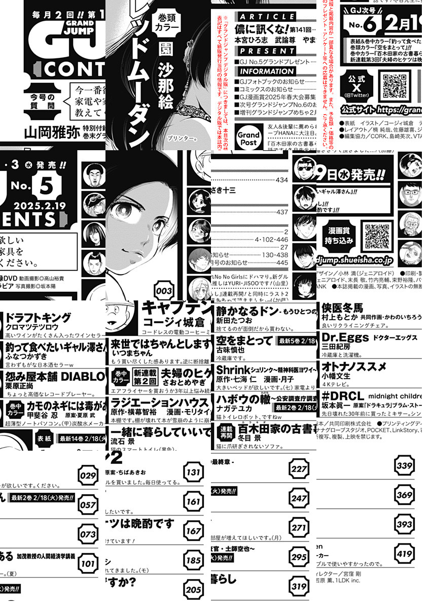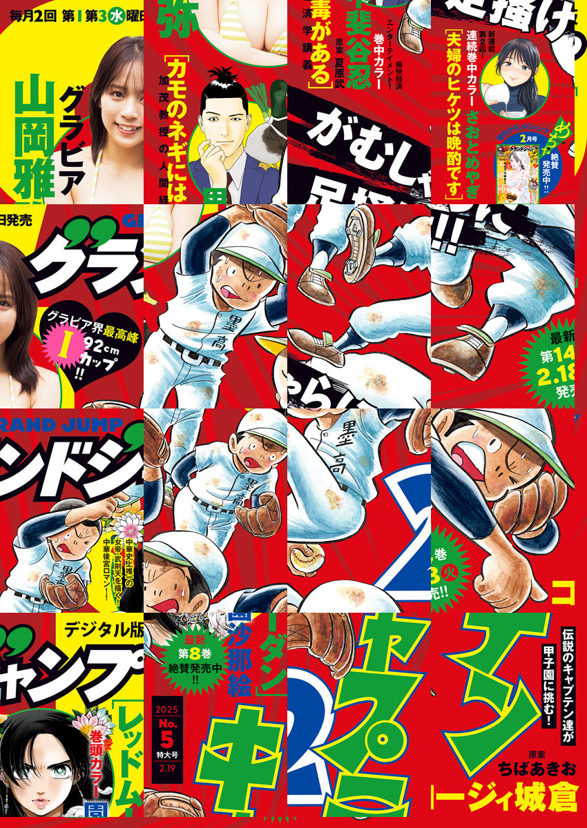 【本号のデジタル版には特別付録DVDは収録されておりません。あらかじめご了承ください】「グランドジャンプ 2025 No.5」、紙と同時に配信!/【表紙】『キャプテン2』(コージィ城倉 原案・ちばあきお)/【巻頭カラー】『レッドムーダン』(園沙那絵)/【巻中カラー】『カモのネギには毒がある 加茂教授の人間経済学講義』(甲斐谷忍 原案・夏原武)、『夫婦のヒケツは晩酌です』(さおとめやぎ)/【連載再開】『百木田家の古書暮らし』(冬目景)/【巻末グラビア】山岡雅弥/ほか、16作品を掲載!