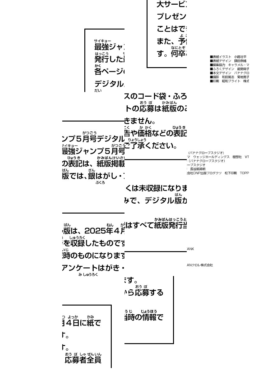 ※デジタル版「最強ジャンプ」は紙版の同号より未掲載のコンテンツがございます。/※デジタル版には紙版の付録は付属しません。あらかじめご了承ください。/「最強ジャンプ 2025年5月号」、紙と同時に配信!/【表紙】『ONE PIECE学園』(小路壮平)/【新連載&巻頭カラー】『ネガッチョ』(安道じょうけい)/【センターカラー】『SAKAMOTO HOLIDAYS』(大川哲)、『ツムギの魔縫』(岩本直輝)/【最終回&センターカラー】『シンカリオン ダイブ ザ ワールド』(原作:澤咲ましの 作画:古屋こう)/【連載再開】『おしりダンディ ザ・ヤング』(原案・監修:トロル 原作・構成:春原ロビンソン 作画:菊池晃弘)/【特別読切】『マモルエブリデイ―僕と未来と過去と宇宙―』(今井ぬぅ)、『恐助くんはコワトモ!』(ふじのかおる)/ほか、盛りだくさんのまんが・最新ゲーム・アニメ・ホビー情報などを掲載!!
