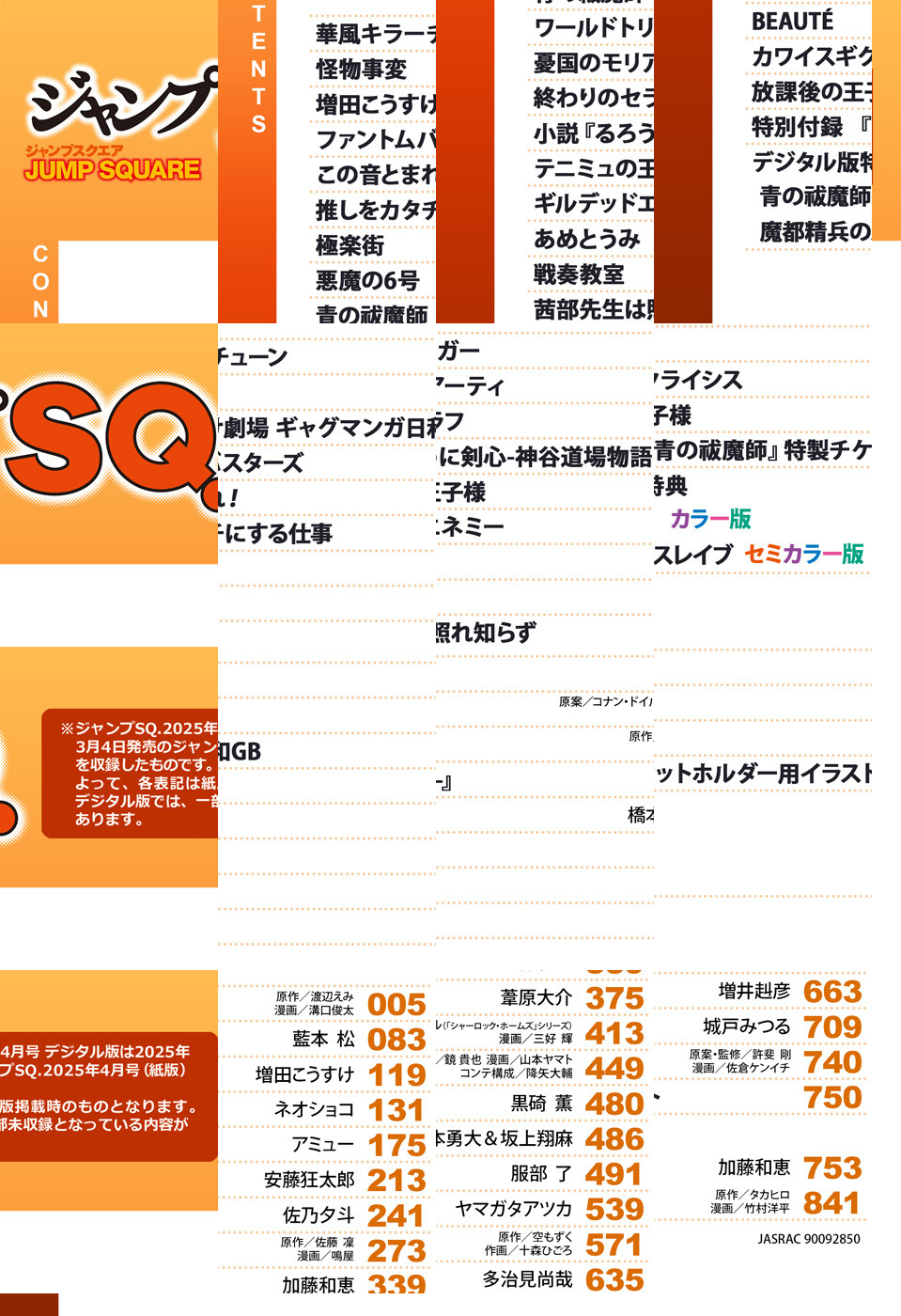 ※「ジャンプSQ.」デジタル版には、紙版の付録は付属しません。ご了承ください。/「ジャンプSQ. 2025年4月号」、紙と同時に配信!/【表紙】『青の祓魔師』(加藤和恵)/【新連載&巻頭カラー】『華風キラーチューン』(原作:渡辺えみ 漫画:溝口俊太)/【センターカラー】『この音とまれ!』(アミュー)、『ギルデッドエネミー』(服部了)/【特別読切&センターカラー】『悪魔の6号』(原作:佐藤凜 漫画:鳴屋)/【特別読切】『BEAUTE』(増井赳彦)/【特別付録】『青の祓魔師』特製チケットホルダー(デジタル版はイラストとして巻末に収録)/【デジタル版特典】『青の祓魔師 カラー版』(加藤和恵)、『魔都精兵のスレイブ セミカラー版』(原作:タカヒロ 漫画:竹村洋平)/ほか、13作品を収録!