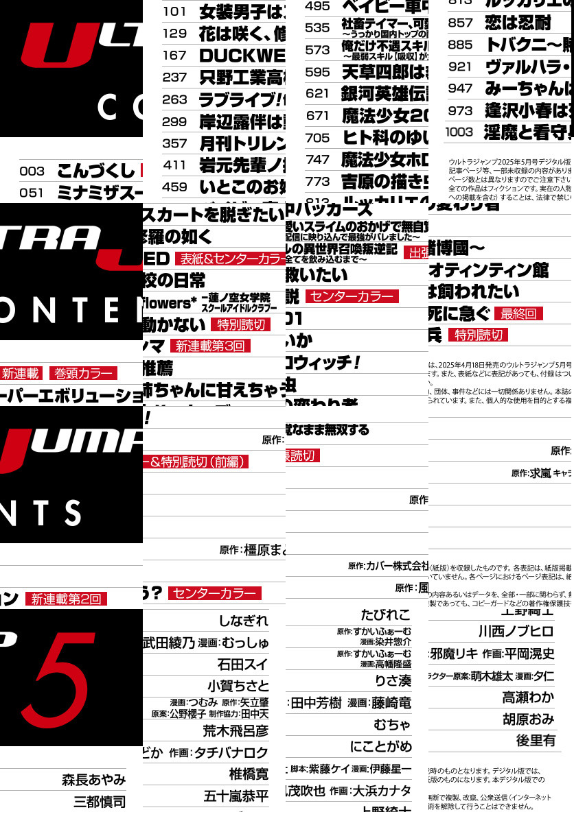 「ウルトラジャンプ 2025年5月号」、紙と同時に配信!/【表紙&センターカラー&特別読切〈前編〉】『DUCKWEED』(石田スイ)/【新連載&巻頭カラー】『こんづくし』(森長あやみ)/【センターカラー】『いとこのお姉ちゃんに甘えちゃう?』(五十嵐恭平)、『銀河英雄伝説』(原作:田中芳樹 漫画:藤崎竜)/【特別読切】『岸辺露伴は動かない』(荒木飛呂彦)、『淫魔と看守兵』(後里有)/【出張読切】『俺だけ不遇スキルの異世界召喚叛逆記~最弱スキル【吸収】が全てを飲み込むまで~』(原作:すかいふぁーむ 漫画:高幡隆盛)/【最終回】『逢沢小春は死に急ぐ』(胡原おみ)/ほか、19作品を掲載!