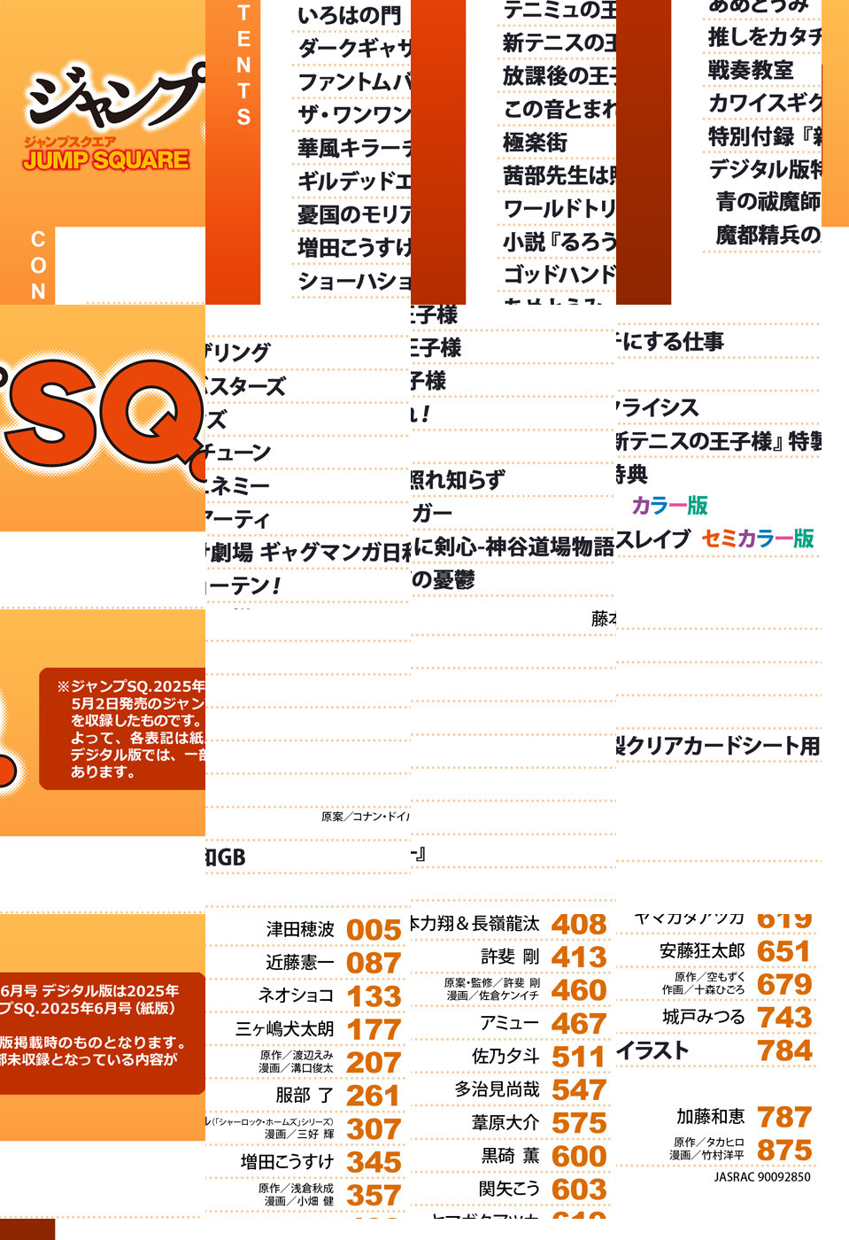 ※「ジャンプSQ.」デジタル版には、紙版の付録は付属しません。ご了承ください。/「ジャンプSQ. 2025年6月号」、紙と同時に配信!/【表紙】『ダークギャザリング』(近藤憲一)/【新連載&巻頭カラー】『いろはの門』(津田穂波)/【センターカラー】『ザ・ワンワンズ』(三ヶ嶋犬太朗)、『憂国のモリアーティ』(原案:コナン・ドイル(「シャーロック・ホームズ」シリーズ) 漫画:三好輝)、『新テニスの王子様』(許斐剛)、『極楽街』(佐乃夕斗)/【特別読切】『ゴッドハンドの憂鬱』(関矢こう)/【特別付録】『新テニスの王子様』特製クリアカードシート(デジタル版はイラストとして巻末に収録)/【デジタル版特典】『青の祓魔師 カラー版』(加藤和恵)、『魔都精兵のスレイブ セミカラー版』(原作:タカヒロ 漫画:竹村洋平)/ほか、13作品を収録!