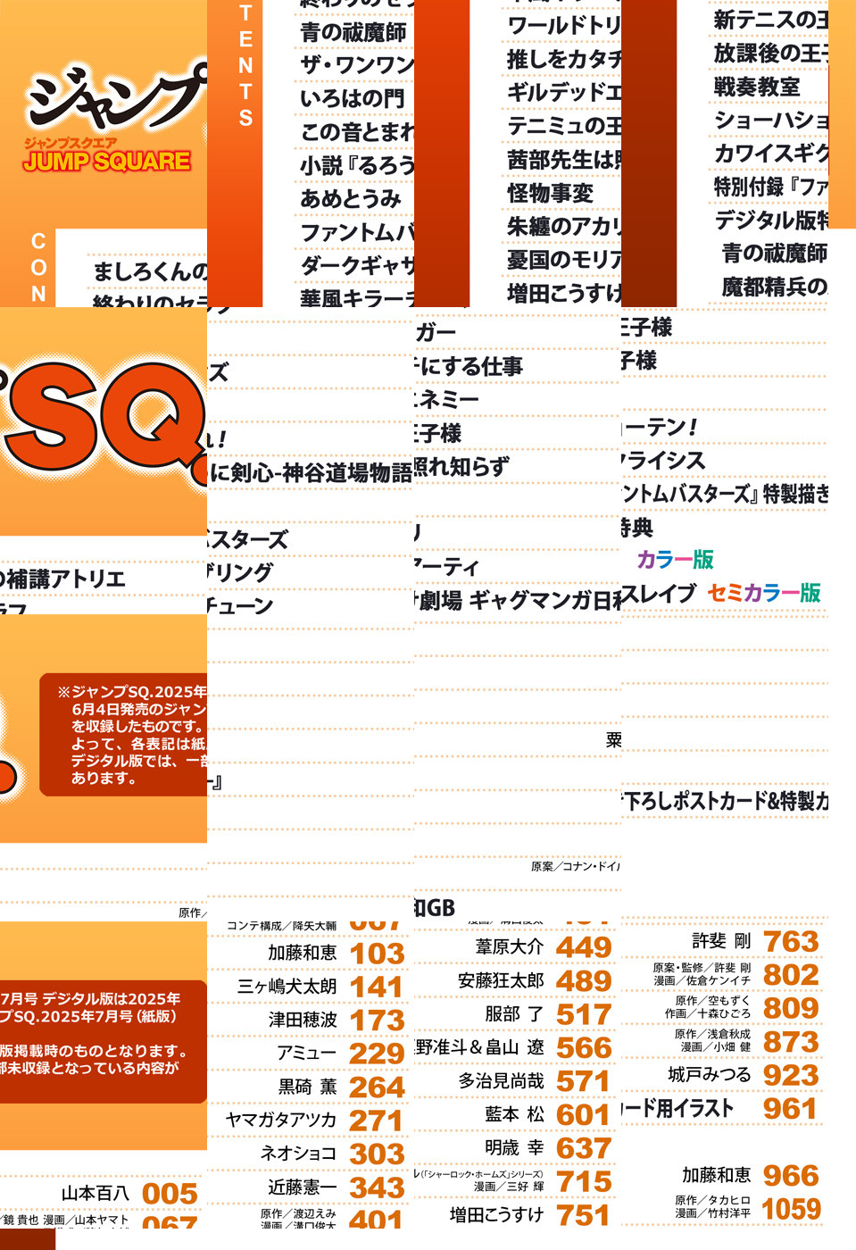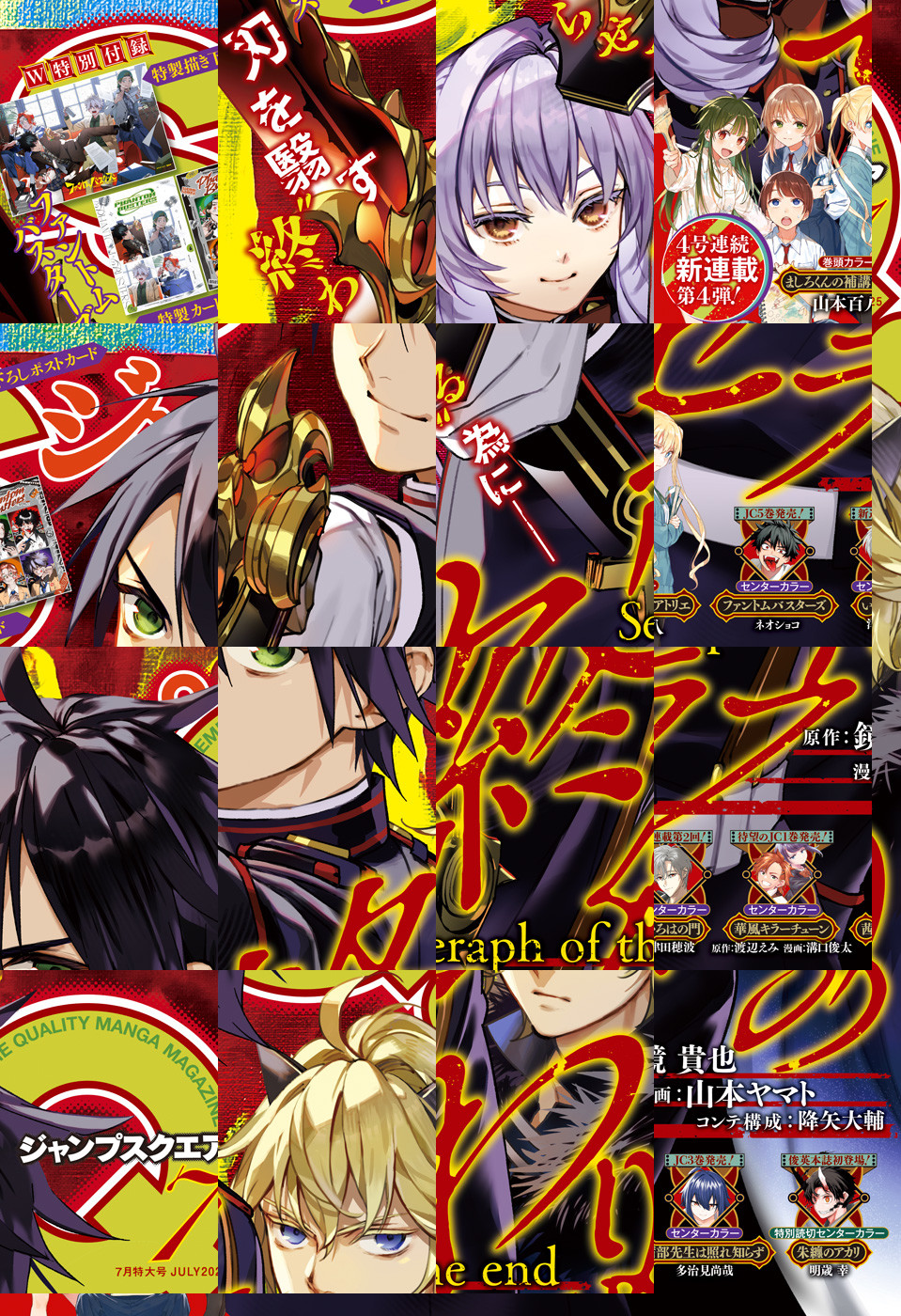 ※「ジャンプSQ.」デジタル版には、紙版の付録は付属しません。ご了承ください。/「ジャンプSQ. 2025年7月号」、紙と同時に配信!/【表紙】『終わりのセラフ』(原作:鏡貴也 漫画:山本ヤマト コンテ構成:降矢大輔)/【新連載&巻頭カラー】『ましろくんの補講アトリエ』(山本百八)/【センターカラー】『いろはの門』(津田穂波)、『ファントムバスターズ』(ネオショコ)、『華風キラーチューン』(原作:渡辺えみ 漫画:溝口俊太)、『茜部先生は照れ知らず』(多治見尚哉)/【特別読切&センターカラー】『朱纏のアカリ』(明歳幸)/【特別付録】『ファントムバスターズ』特製描き下ろしポストカード&特製カード(デジタル版はイラストとして巻末に収録)/【デジタル版特典】『青の祓魔師 カラー版』(加藤和恵)、『魔都精兵のスレイブ セミカラー版』(原作:タカヒロ 漫画:竹村洋平)/ほか、16作品を収録!
