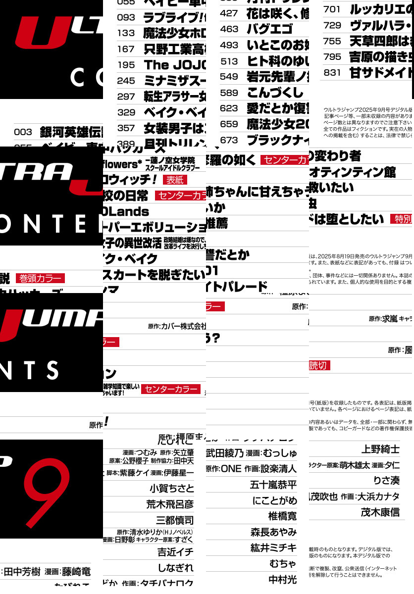 「ウルトラジャンプ 2025年9月号」、紙と同時に配信!/【表紙】『魔法少女ホロウィッチ!』(原作:カバー株式会社 脚本:紫藤ケイ 漫画:伊藤星一)/【巻頭カラー】『銀河英雄伝説』(原作:田中芳樹 漫画:藤崎竜)/【センターカラー】『只野工業高校の日常』(小賀ちさと)、『転生アラサー女子の異世改活 政略結婚は嫌なので、雑学知識で楽しい改革ライフを決行しちゃいます!』(原作:清水ゆりか(HJノベルス) 漫画:日野彰 キャラクター原案:すざく)、『花は咲く、修羅の如く』(原作:武田綾乃 漫画:むっしゅ)/【特別読切】『甘サドメイドは堕としたい』(茂木康信)/ほか、19作品を掲載!