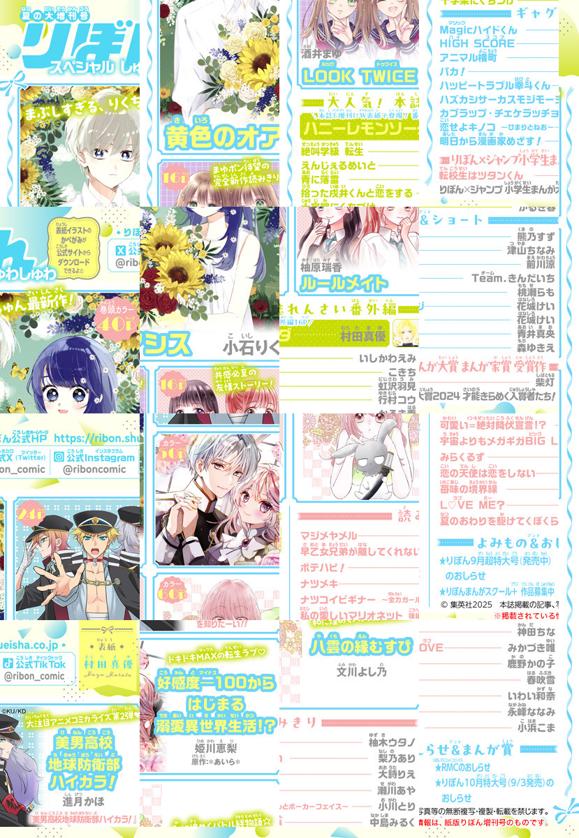 ★暑くて苦しいこの世界で、キミの隣だけが心地いい。 小石りく「黄色のオアシス」 ★祓い屋の家系に生まれた八雲の相棒に選ばれた妖は…兎!? 文川よし乃「八雲の縁むすび」 ★絵麻の憧れは決して会えない王子様…のはずだったけど…? 姫川恵梨 原作:*あいら*「好感度-100からはじまる溺愛異世界生活!?」 ★大人気アニメコミカライズ第2弾! 進月かほ「美男高校地球防衛部ハイカラ!」 ★本誌&増刊W表紙記念! スペシャル読みきり 村田真優「ハニーレモンソーダ」番外編 ★見た目は瓜二つの2人だけど…? 酒井まゆ「LOOK TWICE」 ★親しき中にも礼儀あり、だけど時々息苦しい――!? 柚原瑞香「ルールメイト」 ★2人と1体の奇妙な同居生活が始まる――。 中島みるく「私の愛しいマリオネット」後編 ★嘘から始まったこの関係が私の胸を締め付ける――。 柚木ウタノ「マジメヤメル」 ★「僕推し」のせがちゃん夏増刊連続登場! 瀬川あや「ナツメキ」 ほか、この夏いちばんのドキドキとときめきを届けます!!