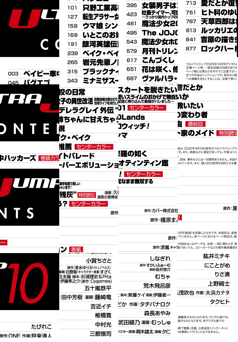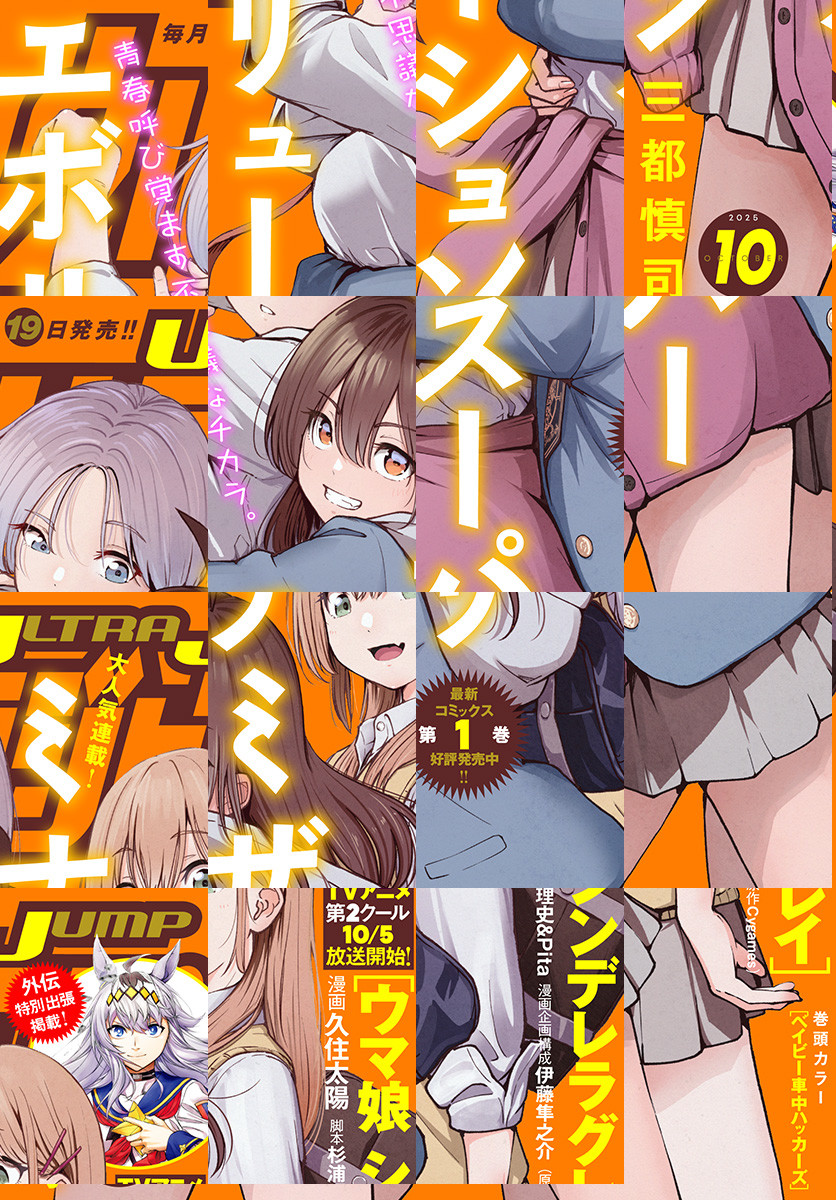 「ウルトラジャンプ 2025年10月号」、紙と同時に配信!/【表紙】『ミナミザスーパーエボリューション』(三都慎司)/【巻頭カラー】『ベイビー車中ハッカーズ』(たびれこ)/【センターカラー】『いとこのお姉ちゃんに甘えちゃう?』(五十嵐恭平)、『岩元先輩ノ推薦』(椎橋寛)、『女装男子はスカートを脱ぎたい!』(しなぎれ)、『魔法少女201』(むちゃ)/【特別読切】『ウマ娘 シンデレラグレイ外伝“残灰”』(漫画:久住太陽 脚本:杉浦理史&Pita 漫画企画構成:伊藤隼之介(原作:Cygames))、『ロックハート家のメイド』(タクヒト)/【最終回】『吉原の描き虫』(原作:風茂吹也 作画:大浜カナタ)/ほか、17作品を掲載!