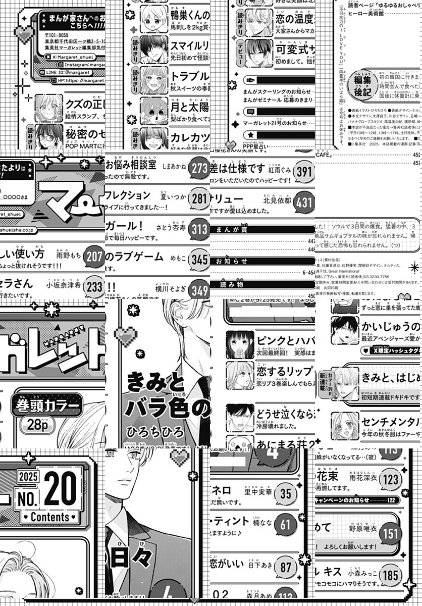 【20号と同日配信!】★ミステリアス男子とのピュア恋 表紙&巻頭カラー ひろちひろ『きみとバラ色の日々』 ★フレッシュ! 短期集中オムニバス新連載 野原唯衣『きみと、はじめて』 ★里中実華『ピンクとハバネロ』、楠なな『恋するリップ・ティント』、日下あき『どうせ泣くなら恋がいい』、雨花深衣『かいじゅうの花束』、小森みっこ『センチメンタル キス』、雨野もち『クズの正しい使い方』、森月あめ『あにまる荘202』、しまあかね『鴨巣くんのお悩み相談室』、めもこ『月と太陽のラブゲーム』、【読みきり】小坂奈津希『秘密のセラさん』、夏いつか『スマイルリフレクション』、さとう杏寿『トラブルガール!』、横川そよぎ『カレカツ!!』、紅雨ぐみ『恋の温度差は仕様です』、【デビュー】北見依都『可変式サリュー』 ※紙版に掲載されている記事は、電子版では掲載していない場合があります。