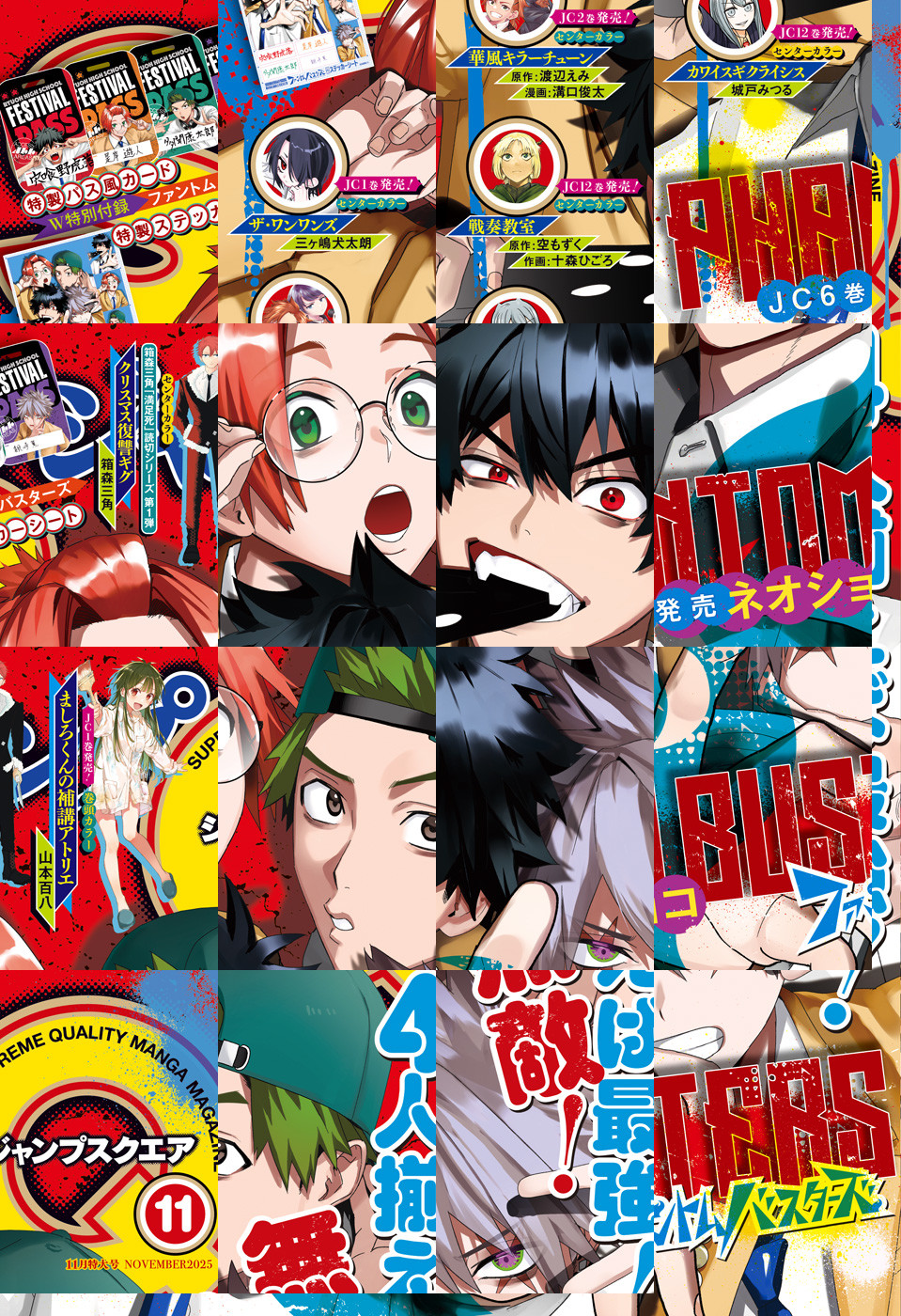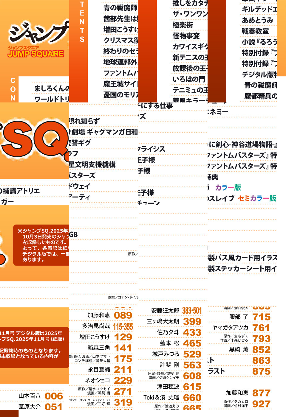※「ジャンプSQ.」デジタル版には、紙版の付録は付属しません。ご了承ください。/「ジャンプSQ. 2025年11月号」、紙と同時に配信!/【表紙】『ファントムバスターズ』(ネオショコ)/【巻頭カラー】『ましろくんの補講アトリエ』(山本百八)/【センターカラー】『ザ・ワンワンズ』(三ヶ嶋犬太朗)、『カワイスギクライシス』(城戸みつる)、『華風キラーチューン』(原作:渡辺えみ 漫画:溝口俊太)、『戦奏教室』(原作:空もずく 作画:十森ひごろ)/【センターカラー&特別読切】箱森三角「満足死」読切シリーズ第1弾『クリスマス復讐ギグ』(箱森三角)/【特別読切】『地球連邦外星文明支援機構』(永目蒼蝿)/【特別付録】『ファントムバスターズ』特製パス風カード&特製ステッカーシート(デジタル版はイラストとして巻末に収録)/【デジタル版特典】『青の祓魔師 カラー版』(加藤和恵)、『魔都精兵のスレイブ セミカラー版』(原作:タカヒロ 漫画:竹村洋平)/ほか、15作品を収録!