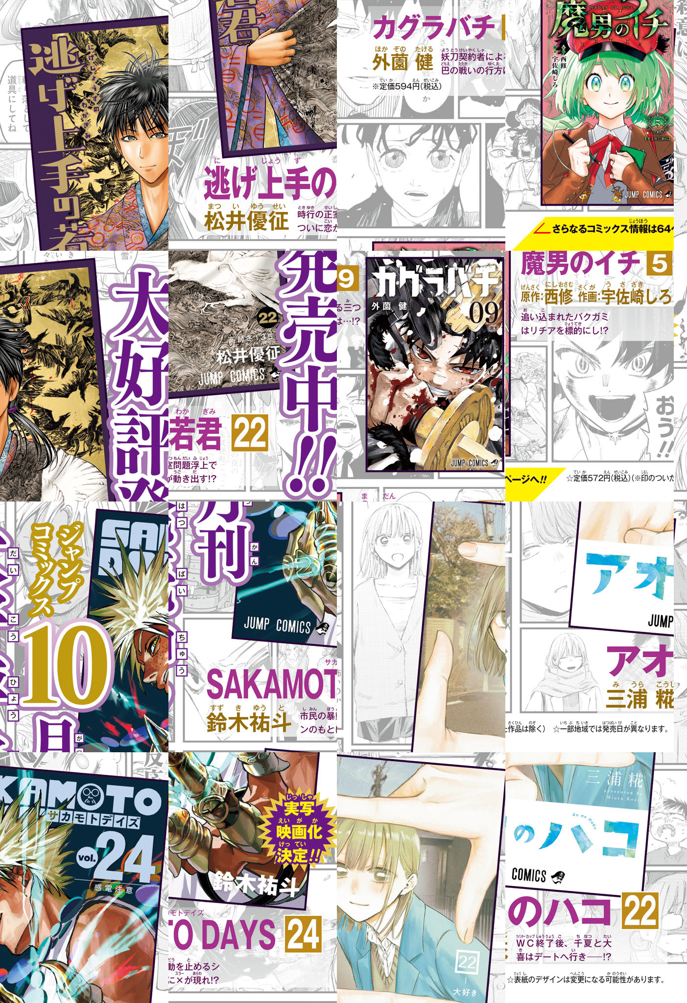 ※「SAKAMOTO DAYS」は休載となります。【記事ページ】も毎号収録!/尊氏との最終決戦の行方はーー!?武蔵野合戦超白熱&コミックス最新22巻大好評発売中!!巻頭カラー!!『逃げ上手の若君』/期待と重圧に打ち克てーー!ジャンプコミックス最新22巻大好評御礼&IH予選開幕直前応援センターカラー!『アオのハコ』/『左門くんはサモナー』『超巡!超条先輩』の沼駿最新作!平凡エージェント男子高生×陽キャ鬼娘女子高生の観察系青春コメディ読切センターカラー48ページ!!『ウラのレポート』/怒涛の超展開!!抜け忍一斉襲撃編大反響御礼センターカラー!!『しのびごと』/※デジタル版では、綴じ込み付録・シリアルコードなど一部未収録となっている内容があります。※収録されている懸賞などは紙版の企画であり、デジタル版では一部ご応募頂けないものがございます。