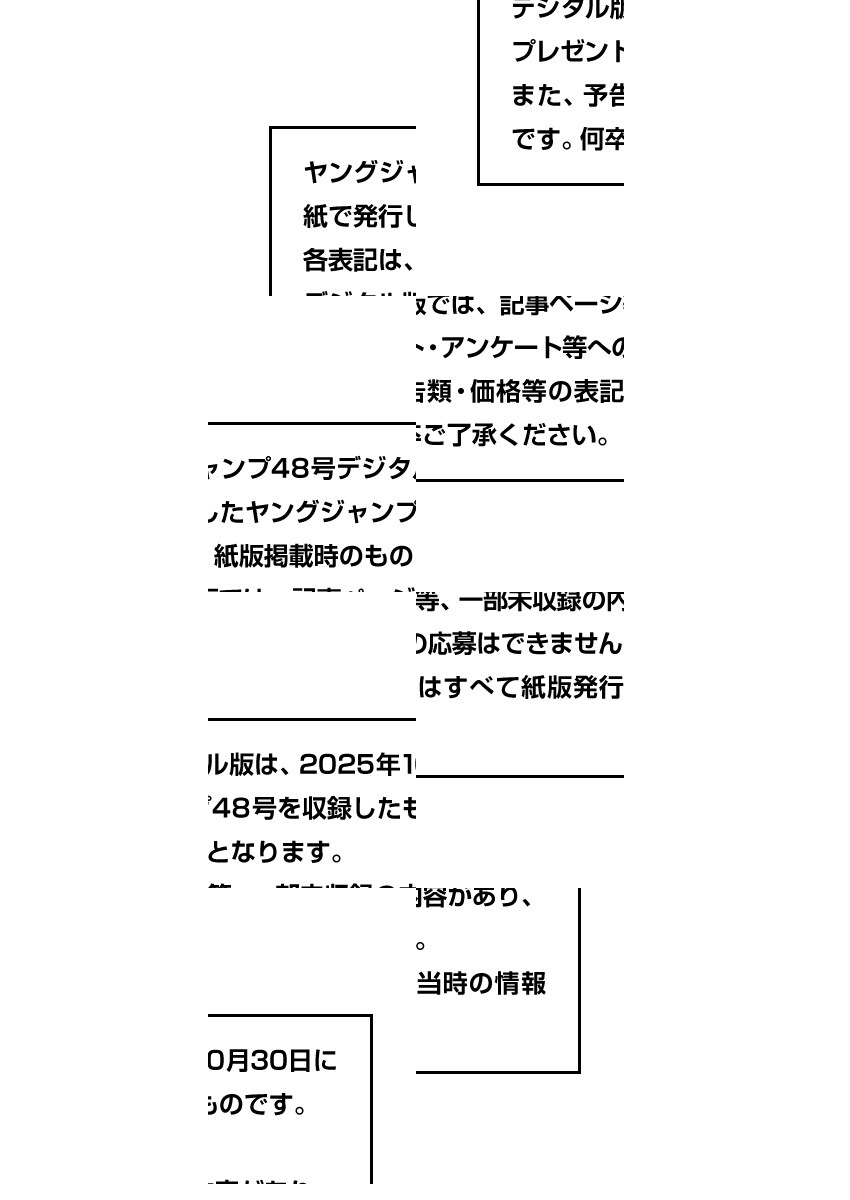 【本号のデジタル版には特別付録「櫻坂46四期生 山川宇衣&佐藤愛桜 特製グラビアステッカー」は収録されておりません。あらかじめご了承ください。】※デジタル版ヤングジャンプは、紙版の同号より未掲載のコンテンツがございます。試し読みファイルのデジタル版目次や注意書きをご確認の上ご購入ください。/「ヤングジャンプ 2025 No.48」、紙と同時に配信!/【表紙&巻頭グラビア】山川宇衣(櫻坂46)/【巻頭カラー】『タツキとタマキ』(吉田ユウマ)/【カラー扉付き】『BUNGO-unreal-』(二宮裕次)/【カラー扉付き&「となりのヤングジャンプ」出張掲載】『やめろ好きになってしまう』(もりぐちあきら)/【特別読切】『ミニスカートの言う通り。』(ぼんち。)/【センターグラビア】佐野なぎさ/【巻末グラビア】佐藤愛桜(櫻坂46)/ほか、17作品を掲載!