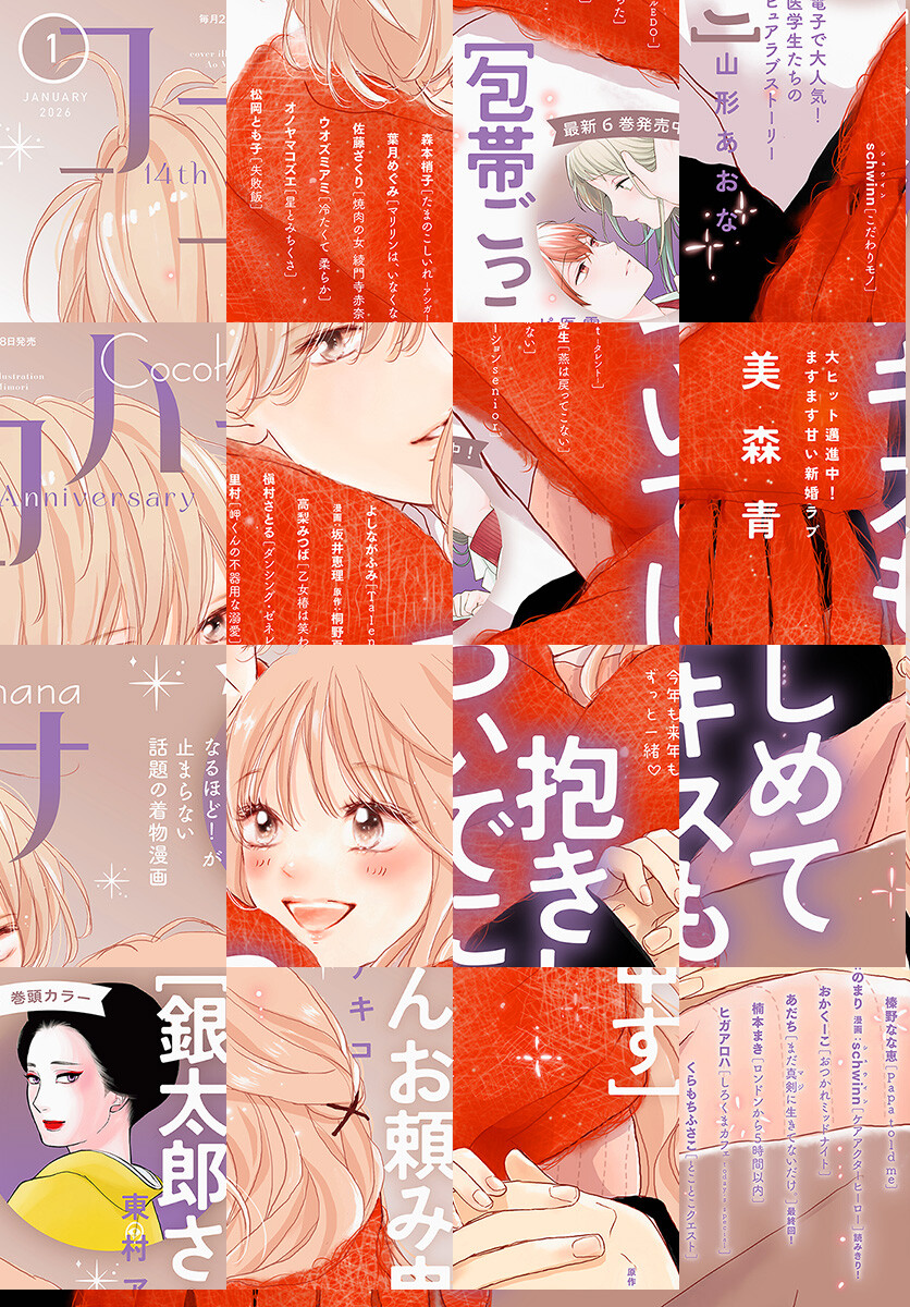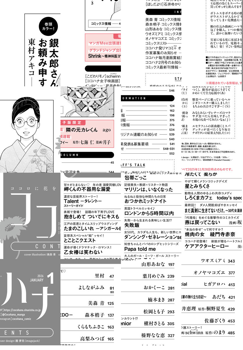 ★ココハナ創刊14周年記念巻頭カラー!! 東村アキコ「銀太郎さんお頼み申す」 ★表紙で登場! 美森青「抱きしめて ついでにキスも」 ★待望の最新6巻発売中! センターカラー 山形あおな「包帯ごっこ」 ★新鋭が贈るハートフル介護読みきり 原作:のまり 漫画:schwinn「ケアアクターヒーロー」 ★最終回! あだち「まだ真剣に生きてないだけ。」 ★里村「岬くんの不器用な溺愛」 ★よしながふみ「Talent―タレント―」 ★森本梢子「たまのこしいれ ―アシガールEDO―」 ★くらもちふさこ「とことこクエスト」 ★高梨みつば「乙女椿は笑わない」 ★葉月めぐみ「マリリンは、いなくなった」 ★おかくーこ「おつかれミッドナイト」 ★楠本まき「ロンドンから5時間以内」 ★松岡とも子「失敗飯」 ★槇村さとる「ダンシング・ゼネレーションsenior」 ★榛野なな恵「Papa told me」 ★ウオズミアミ「冷たくて 柔らか」 ★オノヤマコズエ「星とみちくさ」 ★ヒガアロハ「しろくまカフェ today's special」 ★漫画:坂井恵理 原作:桐野夏生「燕は戻ってこない」 ★佐藤ざくり「焼肉の女 綾門寺赤奈」 ★schwinn「こだわりモノ」 ★石井ゆかり「ほしだより」 ★電子版出張連載1 ago「隣の元カレくん」 ★電子版出張連載2 原作:七海仁 漫画:月子「Shrink~精神科医ヨワイ~」 ※紙版に掲載されている作品・記事が、都合により電子版では掲載がない場合があります。