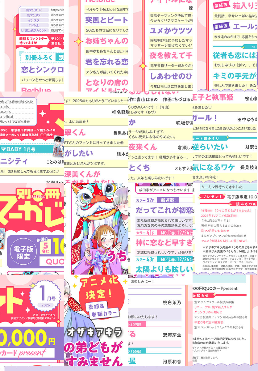 ★表紙&巻頭カラー オザキアキラ「うちの弟どもがすみません」 ★新連載 巻中カラー 桃白茉乃「だってこれが初恋」 ★巻中カラー 双海芽生「神に恋など早すぎる」 ★巻中カラー 河原和音「太陽よりも眩しい星」 ★ことのは紬「恋とシンクロニシティ」 ★加瀬まつり「Re:blue」 ★椎名軽穂「突風とビート」 ★目黒あむ「お姉ちゃんの翠くん」 ★結木悠「君を忘れる恋がしたい」 ★原作:青山はるの 作画:ちづはるか「となりの席の深美くんがアイドルになるかもしれない」 ★咲坂伊緒「ユメかウツツか」 ★倉瀬しの「夜を教えて千夜来くん」 ★ともすえ葵「しあわせのひとくち」 ★最終回 桜山結「箱入り王子と執事姫」 ★最終回 田中ゆちあ「エールガール!」 ★読みきり 月奈子「従者も恋には逆らいたい」 ★読みきり 長見枝茉「キミの手元が気になるワケ」 ◇別冊ふろく[別マ BABY 1月号]…カワタ渚、泉麦歩、佑紀友恵、小鳩ぐみ、絢瀬もも子、三井さや、浅川あめ、たなか萌 ◇電子版特別掲載! 河原和音「先生!」1話 ※紙版に掲載されている記事は、電子版では掲載していない場合があります。