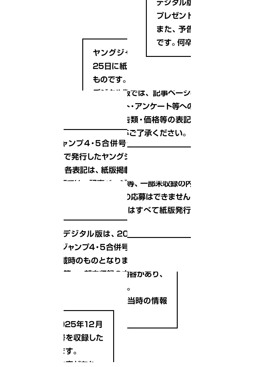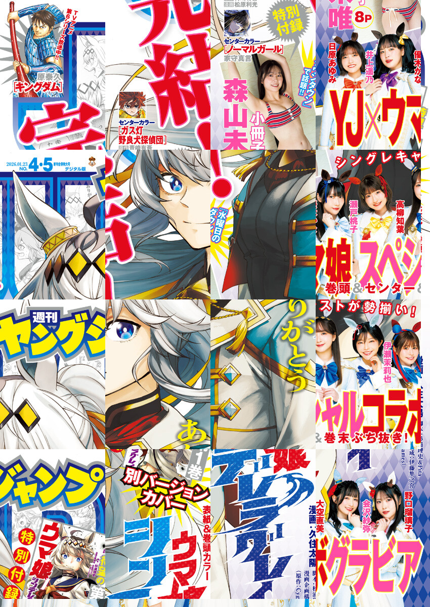 【本号のデジタル版には特別付録「『ウマ娘 シンデレラグレイ』第1巻別ver.カバー」は収録されておりません。あらかじめご了承ください。】※デジタル版ヤングジャンプは、紙版の同号より未掲載のコンテンツがございます。試し読みファイルのデジタル版目次や注意書きをご確認の上ご購入ください。/「ヤングジャンプ 2026 No.4&5合併号」、紙と同時に配信!/【表紙&巻頭カラー&最終回】『ウマ娘 シンデレラグレイ』(漫画:久住太陽 脚本:杉浦理史&Pita 漫画企画構成:伊藤隼之介(原作:Cygames))/【巻頭&センター&巻末グラビア】YJ×ウマ娘スペシャルコラボグラビア/【特別付録】「森山未唯」8P小冊子/【センターカラー】『ガス灯野良犬探偵団』(原作:青崎有吾 漫画:松原利光)、『ノーマルガール』(家守真言)/ほか、20作品を掲載!