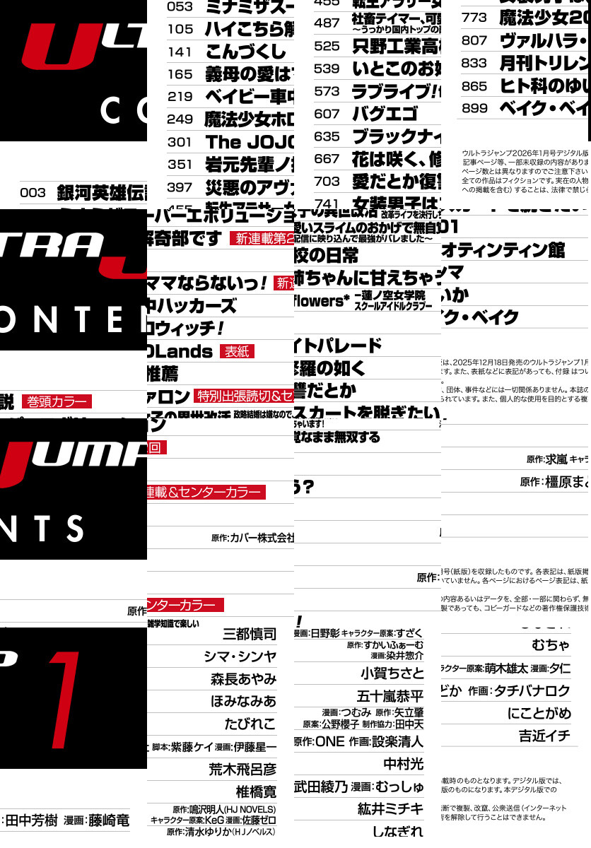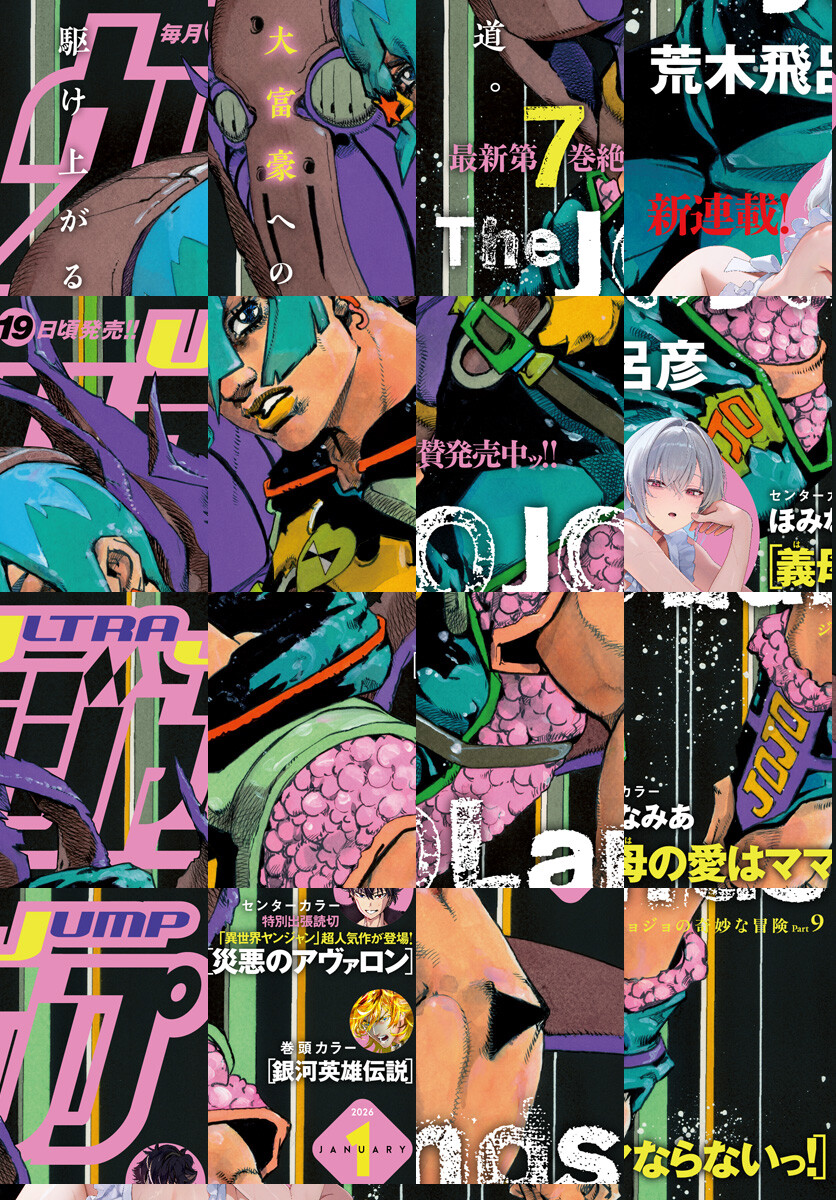 「ウルトラジャンプ 2026年1月号」、紙と同時に配信!/【表紙】ジョジョの奇妙な冒険 第9部『The JOJOLands』(荒木飛呂彦)/【巻頭カラー】『銀河英雄伝説』(原作:田中芳樹 漫画:藤崎竜)/【新連載&センターカラー】『義母の愛はママならないっ!』(ほみなみあ)/【特別出張読切&センターカラー】『災悪のアヴァロン』(原作:鳴沢明人(HJ NOVELS) キャラクター原案:KeG 漫画:佐藤ゼロ)/ほか、21作品を掲載!