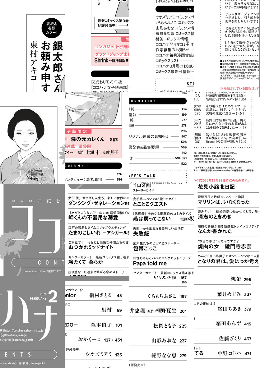 ★既刊続々重版!! 最新9巻発売中! 表紙&巻頭カラー 東村アキコ「銀太郎さんお頼み申す」 ★海外でも話題! 待望の最新6巻発売中!! センターカラー ウオズミアミ「冷たくて 柔らか」 ★最新4巻発売記念! センターカラー 桃缶「花見小路北日記」 ★真っ直ぐすぎる愛が溢れるLOVE読みきり! 峯田ちあき「清志のときめき」 ★新感覚トレインコメディ!? 読みきり 箱田あんず「なんか書かれた」 ★槇村さとる「ダンシング・ゼネレーションsenior」 ★里村「岬くんの不器用な溺愛」 ★森本梢子「たまのこしいれ ―アシガールEDO―」 ★2本立て! おかくーこ「おつかれミッドナイト」 ★いくえみ綾「1日2回」 ★くらもちふさこ「とことこクエスト」 ★漫画:坂井恵理 原作:桐野夏生「燕は戻ってこない」 ★松岡とも子「失敗飯」 ★山形あおな「包帯ごっこ」 ★榛野なな恵「Papa told me」 ★葉月めぐみ「マリリンは、いなくなった」 ★佐藤ざくり「焼肉の女 綾門寺赤奈」 ★中野コトハ「となりの君は、愛ばっか考えてる」 ★午後「こだわりモノ」 ★石井ゆかり「ほしだより」 ★電子版出張連載1 ago「隣の元カレくん」 ★電子版出張連載2(最終回) 原作:七海仁 漫画:月子「Shrink~精神科医ヨワイ~」 ※紙版に掲載されている作品・記事が、都合により電子版では掲載がない場合があります。
