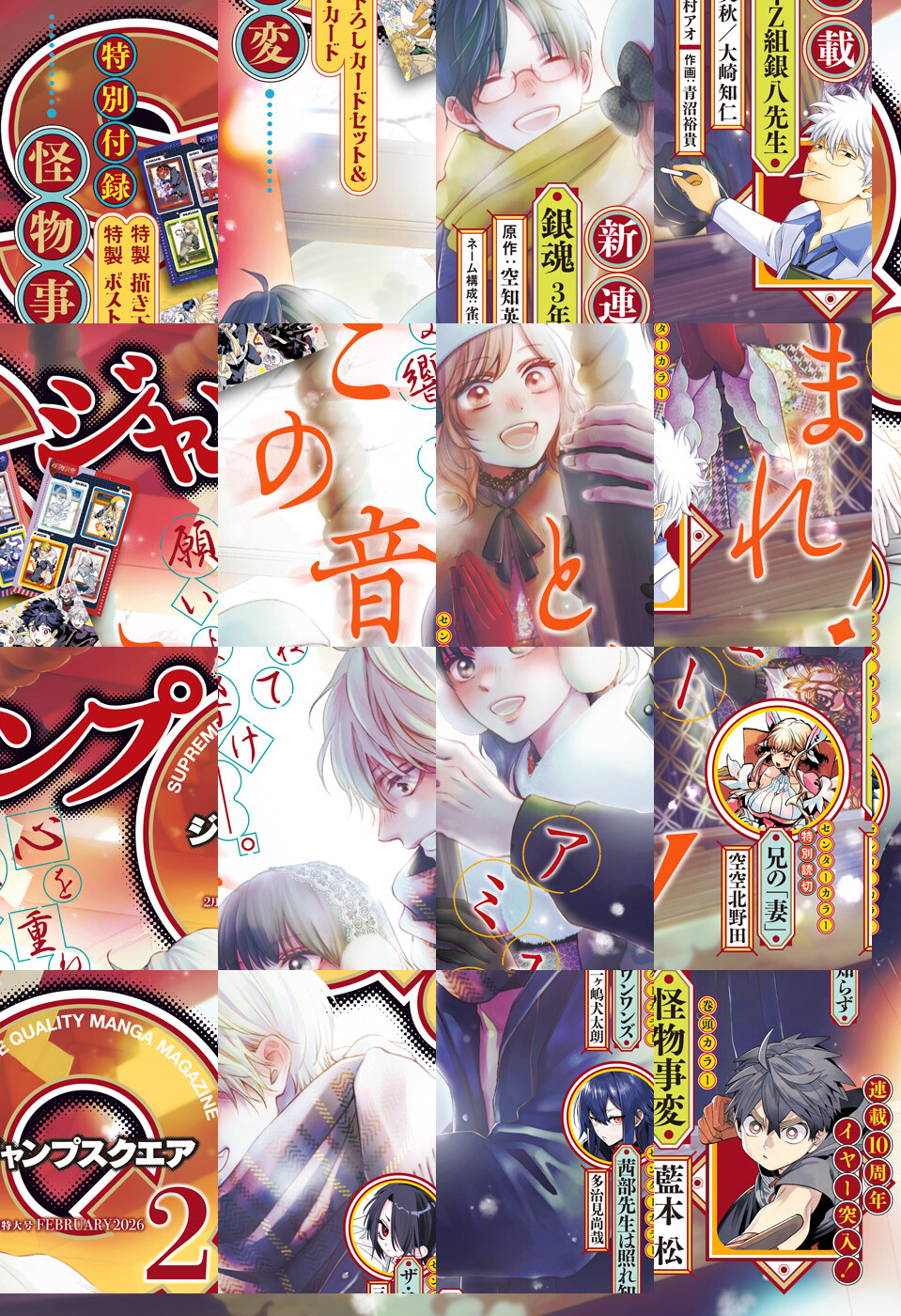 ※「ジャンプSQ.」デジタル版には、紙版の付録は付属しません。ご了承ください。/「ジャンプSQ. 2026年2月号」、紙と同時に配信!/【表紙】『この音とまれ!』(アミュー)/【巻頭カラー】『怪物事変』(藍本松)/【新連載&センターカラー】『銀魂 3年Z組銀八先生』(作画:青沼裕貴 ネーム構成:雀村アオ 原作:空知英秋/大崎知仁)/【センターカラー】『茜部先生は照れ知らず』(多治見尚哉)、『ザ・ワンワンズ』(三ヶ嶋犬太朗)/【特別読切&センターカラー】『兄の「妻」』(空空北野田)/【特別読切】『作画崩壊』(秋尾成)、『死んでよ!ヒロインちゃん』(犬星ちあき)/【特別付録】『怪物事変』特製描き下ろしカードセット&特製ポストカード(デジタル版はイラストとして巻末に収録)/【デジタル版特典】『青の祓魔師 カラー版』(加藤和恵)、『魔都精兵のスレイブ セミカラー版』(原作:タカヒロ 漫画:竹村洋平)/ほか、16作品を収録!