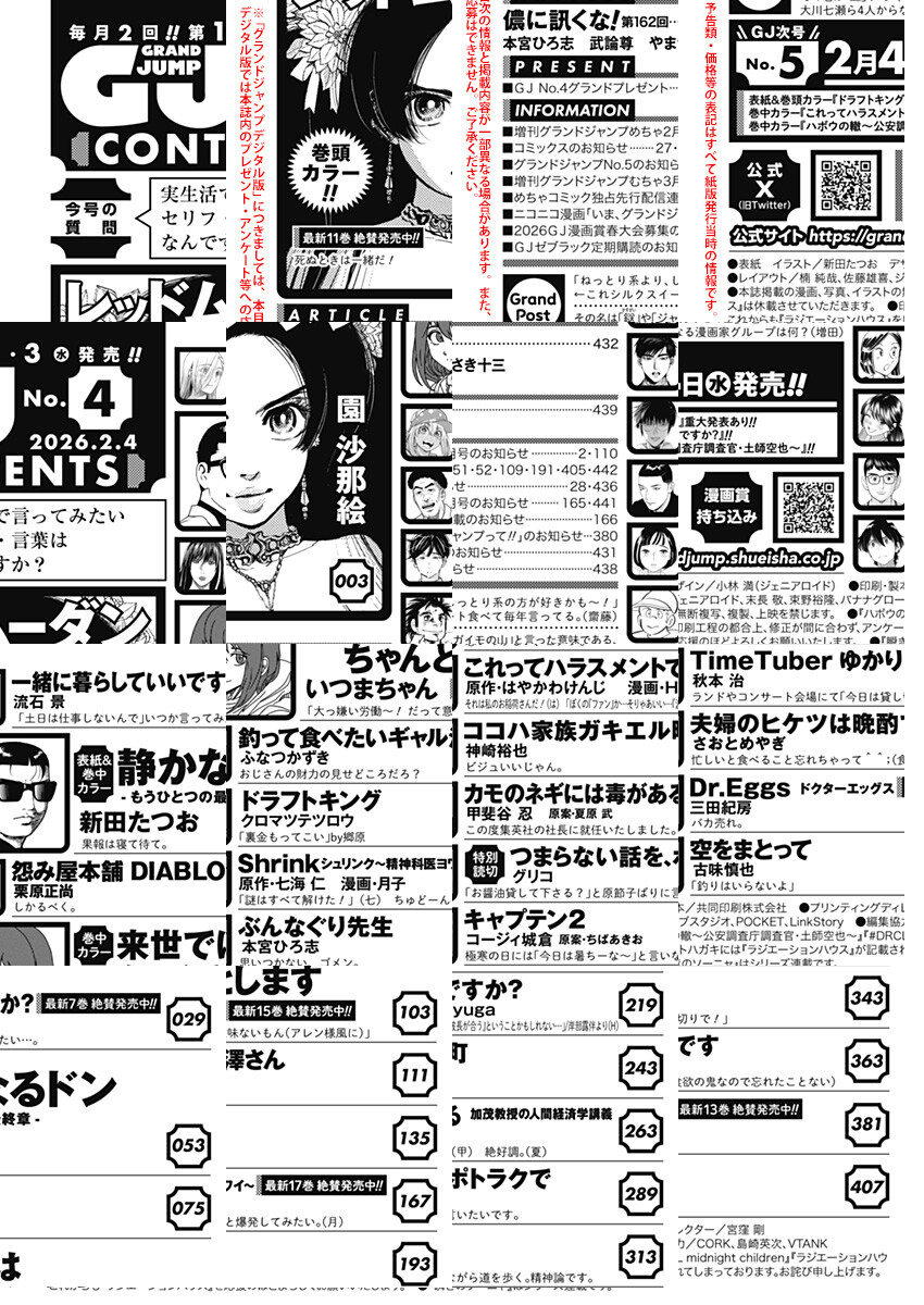 「グランドジャンプ 2026 No.4」、紙と同時に配信!/【表紙&巻中カラー】『静かなるドン―もうひとつの最終章―』(新田たつお)/【巻頭カラー】『レッドムーダン』(園沙那絵)/【巻中カラー】『来世ではちゃんとします』(いつまちゃん)/【特別読切】『つまらない話を、ポトラクで』(グリコ)/ほか、14作品を掲載!