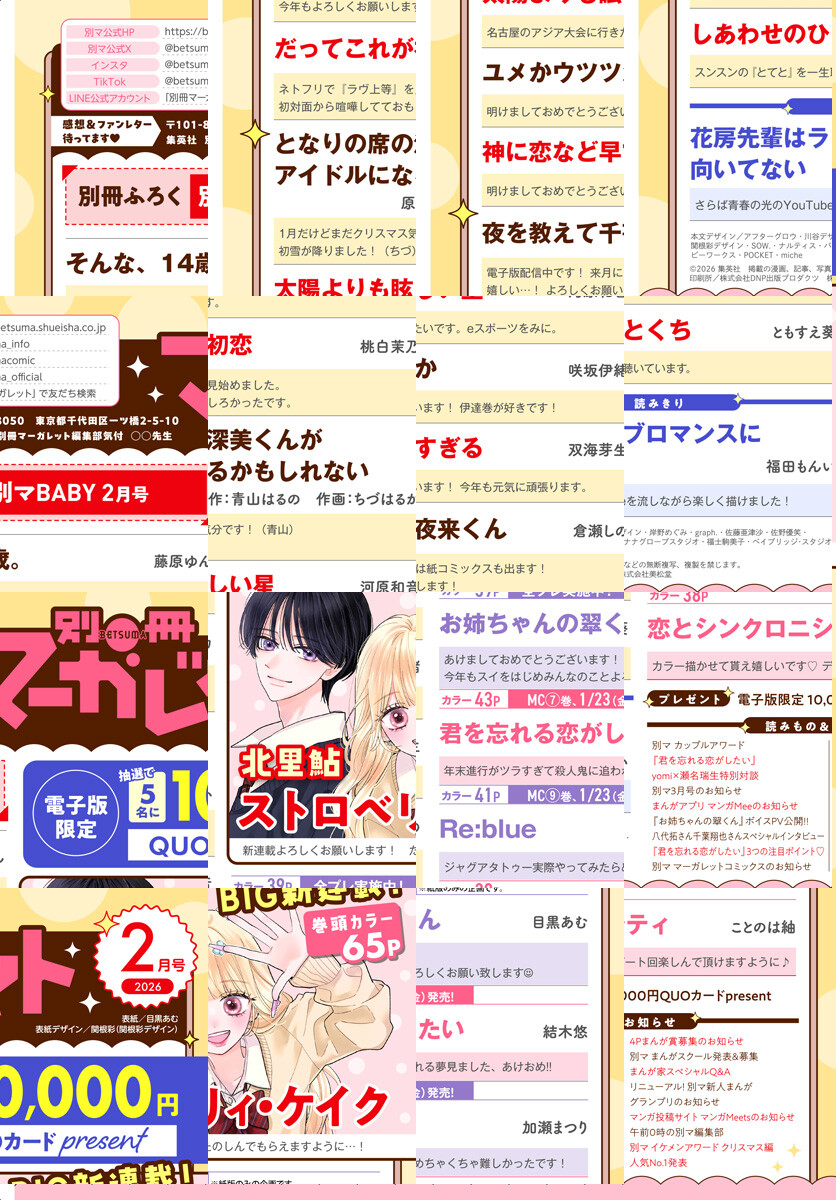 ★表紙&巻中カラー 目黒あむ「お姉ちゃんの翠くん」 ★新連載 巻頭カラー 北里鮎「ストロベリィ・ケイク」 ★巻中カラー 結木悠「君を忘れる恋がしたい」 ★巻中カラー 加瀬まつり「Re:blue」 ★巻中カラー ことのは紬「恋とシンクロニシティ」 ★藤原ゆん「そんな、14歳。」 ★桃白茉乃「だってこれが初恋」 ★原作:青山はるの 作画:ちづはるか「となりの席の深美くんがアイドルになるかもしれない」 ★河原和音「太陽よりも眩しい星」 ★咲坂伊緒「ユメかウツツか」 ★双海芽生「神に恋など早すぎる」 ★倉瀬しの「夜を教えて千夜来くん」 ★ともすえ葵「しあわせのひとくち」 ★読みきり 福田もんい「花房先輩はラブロマンスに向いてない」 ◇別冊ふろく[別マ BABY 2月号]…あずき砂夜花、麻乃くく、月奈子、五月さつき、泉麦歩、よし藤夏生、深山依月 ※紙版に掲載されている記事は、電子版では掲載していない場合があります。