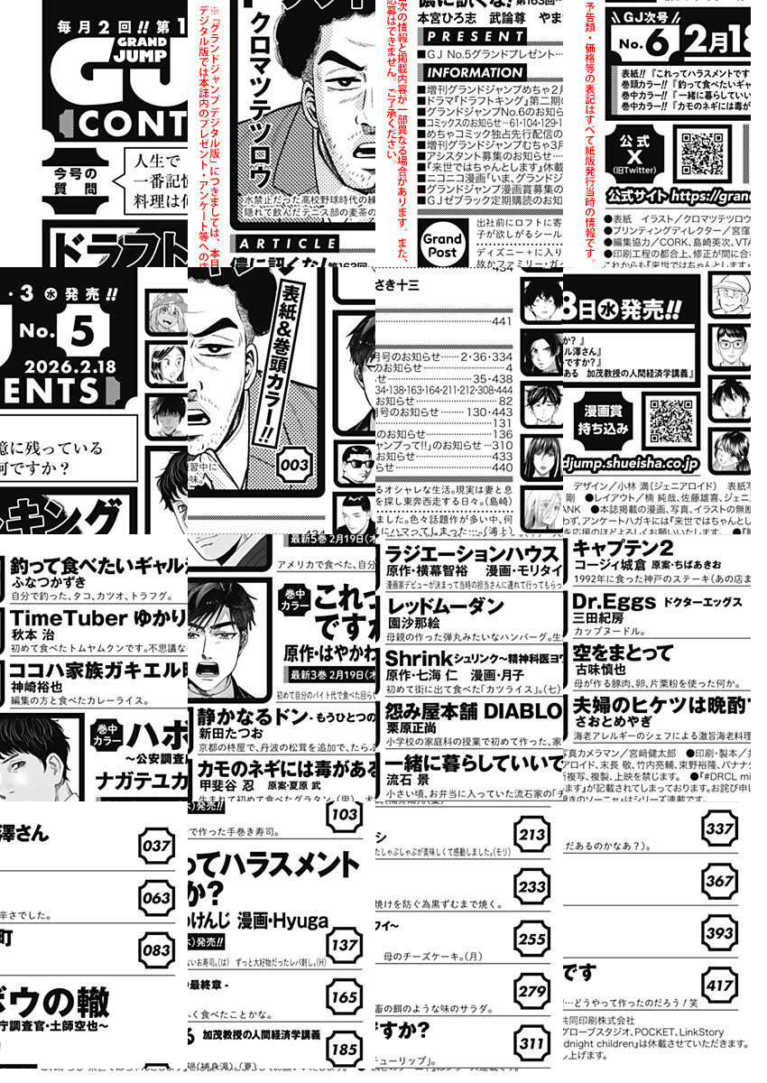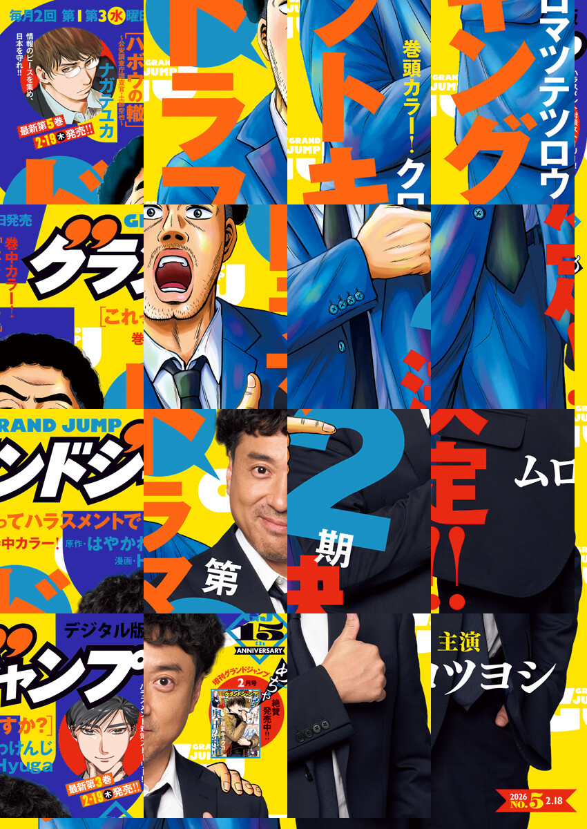 「グランドジャンプ 2026 No.5」、紙と同時に配信!/【表紙&巻頭カラー】『ドラフトキング』(クロマツテツロウ)/【巻中カラー】『ハボウの轍~公安調査庁調査官・土師空也~』(ナガテユカ)、『これってハラスメントですか?』(原作・はやかわけんじ 漫画・Hyuga)/ほか、14作品を掲載!
