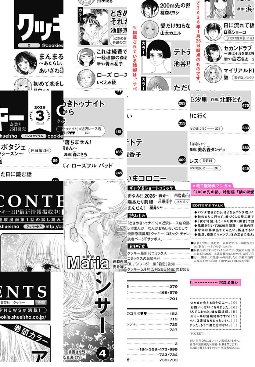 ★レジェンド連載2026年最新作! 表紙&カラー32P 池野恋「ときめきトゥナイト それから」 ★待望の連載再開! 巻頭カラー55P Maria「アンサー」 ★最新7巻2月25日発売! カラー60P 池谷理香子「テトテトテ」 ★カラー57P 原作:浜心汐里 作画:北野とも「ただいまコロニー」 ★注目の連載第2話! 52P あいざわ遥「まんまるポタジェ~あたらしいシーズン~」 ★一挙2話掲載! 64P 原作:白石さよ 漫画:美名森タンデュ「セカンドラブ~彼はそれを愛と呼ばない~」 ★持田あき「初めて恋をした日に読む話」 ★桃森ミヨシ「200m先の熱」 ★原作:青木祐子 漫画:森こさち「これは経費で落ちません!~経理部の森若さん~」 ★いくえみ綾「ローズ ローズィ ローズフル バッド」 ★日高ショーコ「日に流れて橋に行く」 ★山本カエル「愛だけ知らない」 ★最終回! 碧「マイリアルドレス」 ★電子版特別掲載! 桃森ミヨシ「200m先の熱 特別編 隣の微熱」VOL.1 ★爆笑ギャグ 櫻井リヤ/杉原涼子/田辺真由美 …and MORE!! ※紙版に掲載されている作品・記事が、電子版では掲載がない場合があります。