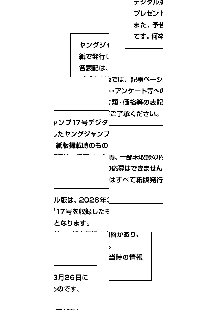 【本号のデジタル版には特別付録「ゴオルデンカムヰ紀念寫眞コレクション 鶴見篤四郎 署名入りブロマイド」は収録されておりません。あらかじめご了承ください。】※デジタル版ヤングジャンプは、紙版の同号より未掲載のコンテンツがございます。試し読みファイルのデジタル版目次や注意書きをご確認の上ご購入ください。/「ヤングジャンプ 2026 No.17」、紙と同時に配信!/【表紙&巻頭グラビア】制コレ24/【特別付録】『制コレ24』8P小冊子/【巻頭カラー】『さよなら僕のアイドル』(伊藤ゆうた)/【センターカラー】『エニグマティカ』(司馬莞爾)、『4軍くん(仮)』(原作:森高夕次 漫画:末広光)/【三週連勝!!! ゲスト作家バトル読切(3)】『レッドカーペットおまかせ』(原作:三ヶ嶋犬太朗 作画:伊達恒大)/【特別読切】『老犬と大リーグのやつ』(フォビドゥン澁川)、『超高速探偵』(中山敦支)、『未完成なふたり』(浅石久楽)/【センターグラビア】伊達さゆり/【巻末グラビア】あゆの/ほか、14作品を掲載!