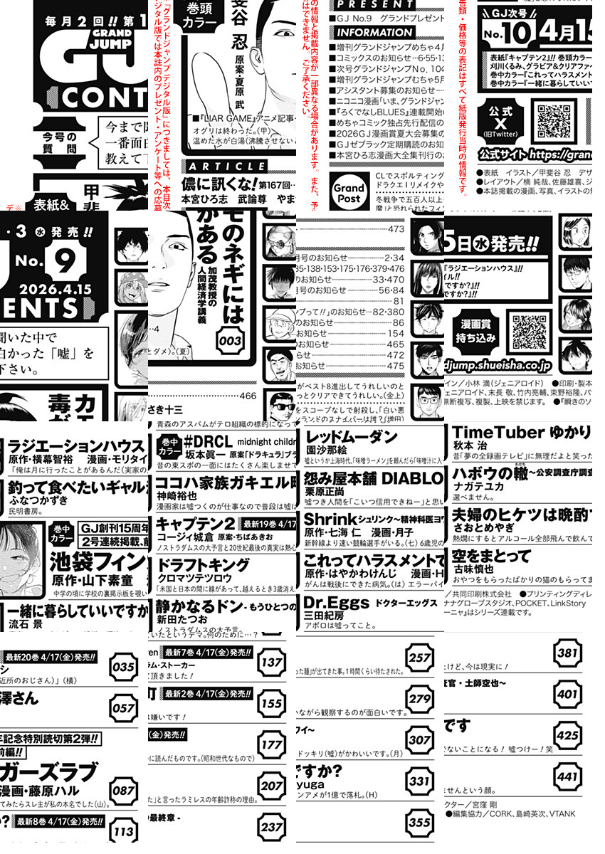 「グランドジャンプ 2026 No.9」、紙と同時に配信!/【表紙&巻頭カラー】『カモのネギには毒がある 加茂教授の人間経済学講義』(甲斐谷忍 原案・夏原武)/【巻中カラー&GJ創刊15周年記念特別読切第2弾&2号連続掲載、前編】『池袋フィンガーズラブ』(原作・山下素童 漫画・藤原ハル)/【巻中カラー】『#DRCL midnight children』(坂本眞一 原案・『ドラキュラ』ブラム・ストーカー)/ほか、17作品を掲載!