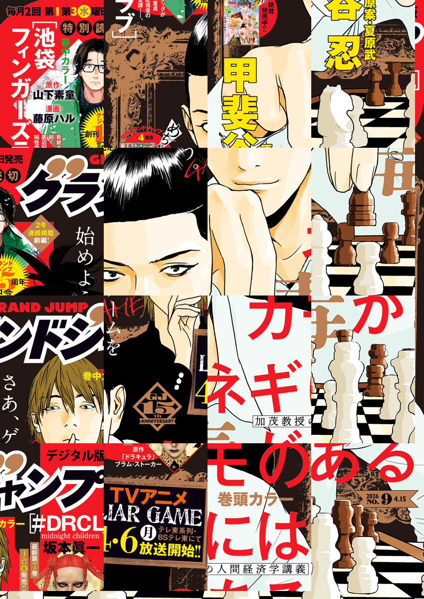 「グランドジャンプ 2026 No.9」、紙と同時に配信!/【表紙&巻頭カラー】『カモのネギには毒がある 加茂教授の人間経済学講義』(甲斐谷忍 原案・夏原武)/【巻中カラー&GJ創刊15周年記念特別読切第2弾&2号連続掲載、前編】『池袋フィンガーズラブ』(原作・山下素童 漫画・藤原ハル)/【巻中カラー】『#DRCL midnight children』(坂本眞一 原案・『ドラキュラ』ブラム・ストーカー)/ほか、17作品を掲載!