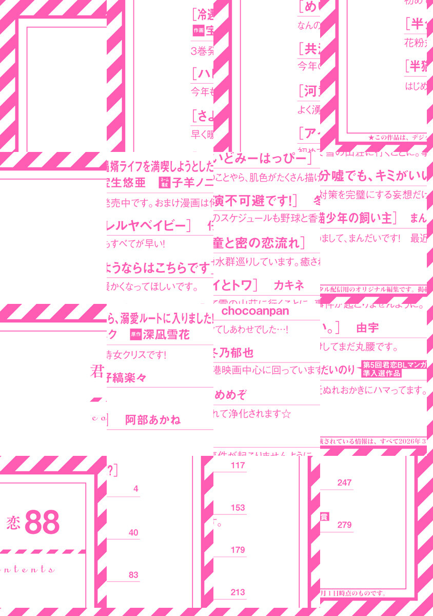 毎月1日配信、「君恋」第88号! あなたが目指す未来を俺も一緒に見てもいいですか? 共にあり続ける先を願う“純愛”BL作品集! 表紙&巻頭は、美麗転生オメガバース「冷遇婿ライフを満喫しようとしたら、溺愛ルートに入りました!?」! 宰相によって王位を追われたアレンは、クリスの支えで戦うことを決意。敵に立ち向かうアレンの無事を願うクリスだが…!? 君恋BLマンガ賞準入選作品を含めて全9作品を収録! 【収録作品】[冷遇婿ライフを満喫しようとしたら、溺愛ルートに入りました!?]作画:宝生悠亜 ネーム構成:子羊ノニク 原作:深凪雪花/[ハレルヤベイビー]仔縞楽々/[さようならはこちらです]阿部あかね/[めいどみーはっぴー]chocoanpan/[共演不可避です!]冬乃郁也/[河童と密の恋流れ]めめぞ/[アイとトワ]カキネ/[半分嘘でも、キミがいい。]由宇/[半猫少年の飼い主]まんだいのり(第5回君恋BLマンガ賞準入選受賞作)