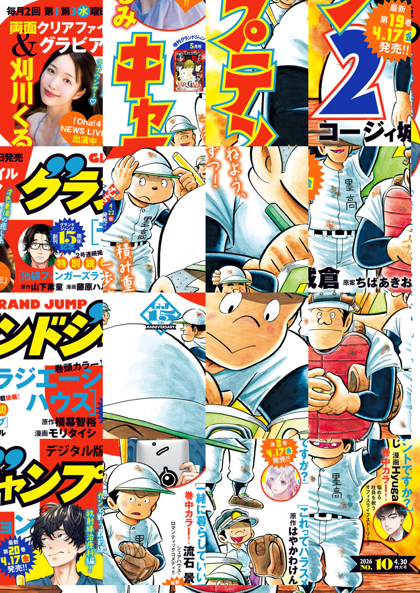 「グランドジャンプ 2026 No.10」、紙と同時に配信!/【表紙】『キャプテン2』(コージィ城倉 原案・ちばあきお)/【巻頭カラー】『ラジエーションハウス』(原作・横幕智裕 漫画・モリタイシ)/【巻中カラー】『一緒に暮らしていいですか?』(流石景)、『これってハラスメントですか?』(原作・はやかわけんじ 漫画・Hyuga)/【GJ創刊15周年記念特別読切第2弾&2号連続掲載、後編】『池袋フィンガーズラブ』(原作・山下素童 漫画・藤原ハル)/【出張掲載】『寧々子ママのお気に召すまま』(寅尾あかまる)/【巻末グラビア】刈川くるみ/【特別付録】クリアファイル 刈川くるみ(デジタル版はグラビアとして巻末に収録)/ほか、14作品を掲載!