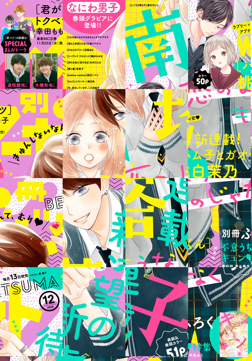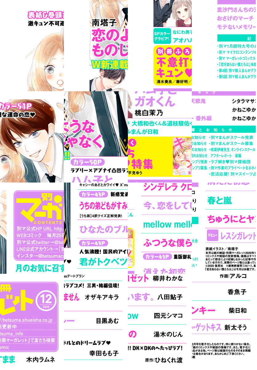 ★「テリトリーMの住人」完結から4か月!最キュン新連載スタート 表紙&巻頭カラー51P 南塔子「恋のようなものじゃなく」 ★期待のフレッシュ新連載 カラー50P 桃白茉乃「ハム子とガオくん」 ☆大人気グループ「なにわ男子」の道枝駿佑くん&大橋和也くんのSPグラビアを電子版にも収録! ★絶好調カラー43P オザキアキラ「うちの弟どもがすみません」 ★コミックス5巻も11/25配信 カラー43P 幸田もも子「君がトクベツ」 ★コミックス4巻が11/25配信 カラー43P 原作:ひねくれ渡×作画:アルコ「消えた初恋」 ★一挙2本立て 木内ラムネ「月のお気に召すまま」 ★目黒あむ「ひなたのブルー」 ★柳井わかな「シンデレラ クロゼット」 ★八田鮎子「今、恋をしています。」 ★四元シマコ「mellow mellow」 ★湯木のじん「ふつうな僕らの」 ★香魚子「春と嵐」 ★柴日和「ちゅうにとヤンキー」 ◇別冊ふろく[不意うちキュン特集]清水奏良/藤好明/平見ゆう ★第4回新人まんがグランプリデビュー 新太そう ☆爆笑ギャグ シタラマサコ/かねこゆかり ※紙版に掲載されている記事やふろくは、電子版では掲載していない場合があります。