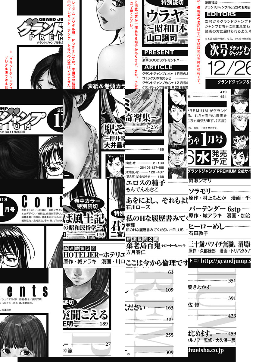 「グランドジャンプPREMIUM」電子版、11月号はリニューアル直前!/表紙&巻頭カラーで最新読切一挙2話掲載! 舞台は昭和、戦後20年の日本。田舎に残る奇しき性の因習を、美人記者が体当たり取材! 『ウラヤミ〜昭和日本奇習集〜』(山口譲司)/巻中カラーには、『明日葉さんちのムコ暮らし』作者が描く特別読切! 平成の終わりに、身近に残る「駅そば」から昭和の価値を問いただす! 『駅そば風土記〜押井馨の昭和民俗学〜』(大井昌和)/W新連載第2回! 凄腕コンシェルジュが演出する、奇跡のような「おもてなし」! 老夫婦がどうしても「ZAIZENホテル」に泊まりたい理由とは? 『HOTELIER—ホテリエ—』(原作・城アラキ 漫画・川口幸範)/W新連載第2回! 高齢過疎化の進んだ島で、突如凄まじい身体能力を発現して凶暴化した老人…。この島に一体何が!? 『棄老島百鬼 キロートーヒャッキ』(方月春仁)/爆発的大ヒット御礼! いたたまれない過去を持ち、2人を殺めた日本画家・昭島薫。彼の弁護を担当した椎名順子は、その隣に居続けようと——! 『エロスの種子』(もんでんあきこ)/実力派作家が描く繊細少女青春譚が特別読切で登場! 母の死をきっかけに人の心の声が聞こえるようになってしまった少女が、田舎の町を訪れて…? 『君が聞こえる』(二宮正明)/さらに大反響御礼の『ここは今から倫理です。』(雨瀬シオリ)、『私のHな履歴書みてください』(春輝)など、大興奮の豪華連載陣が続々!
