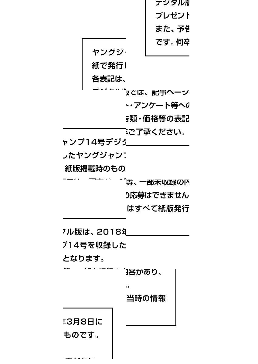 ※デジタル版ヤングジャンプは、紙版の同号より未掲載のコンテンツがございます。試し読みファイルのデジタル版目次や注意書きをご確認の上ご購入ください。/誌面いっぱいに咲き乱れる人気沸騰のヒロインたちが、春の訪れをお知らせ! 「ヤングジャンプ 2018 No.14」、配信!/YJ本誌での連載もまもなく2周年、記念の巻頭カラー! 生徒会一同に寄せられた、とある依頼とは…!? 『かぐや様は告らせたい〜天才たちの恋愛頭脳戦〜』(赤坂アカ)/カラー扉付き! ミラクルジャンプで注目を集めた『悪童文庫』の作者が贈る特別読切! 『特務罪科執行 十三階段』(田中基)/優良ガールズトーク盗み聞きコメディ、反響御礼のカラー扉付き! いまりとしずかの心理ゲーム勝負、その行方は? 『優良少女ファミリヤン』(カワカミ)/カラー扉付きで贈る、大反響お色気くノ一コメディ! 現代に戻ったイチを付け狙う謎の刺客の正体は…? 『クノイチノイチ!ノ弐』(金沢真之介 ストーリー協力:山本カズヨシ)/『キングダム』(原泰久)、『ゴールデンカムイ』(野田サトル)、『干物妹!うまるちゃんG』(サンカクヘッド)など、百花繚乱の連載陣も見逃せない!