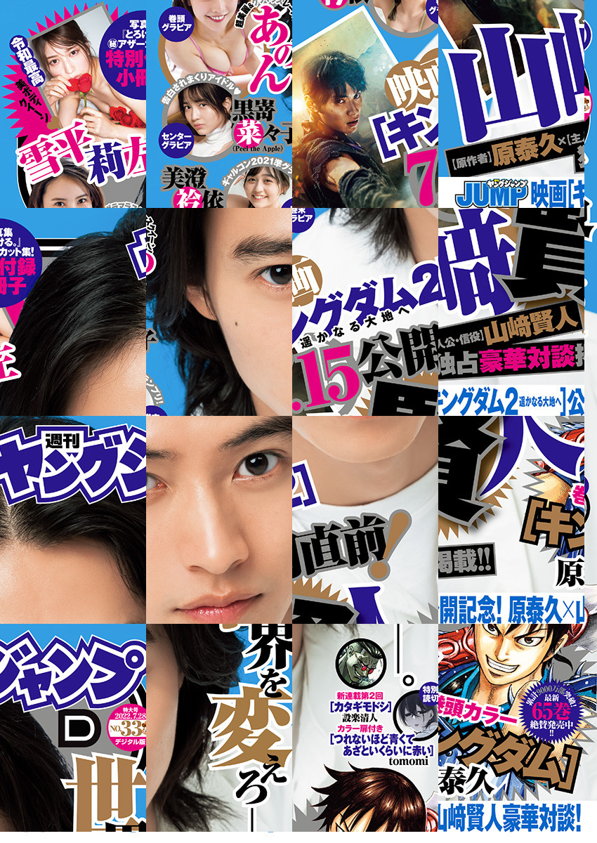 ※デジタル版ヤングジャンプは、紙版の同号より未掲載のコンテンツがございます。試し読みファイルのデジタル版目次や注意書きをご確認の上ご購入ください。/「ヤングジャンプ 2022 No.33」、紙と同時に配信!/【表紙】山崎賢人/【巻頭グラビア】あのん/【巻頭カラー】『キングダム』(原泰久)/【カラー扉付き】『スナックバス江』(フォビドゥン澁川)/【カラー扉付き&特別読切&となりのYJ出張番外編】『つれないほど青くて あざといくらいに赤い』(tomomi)/【となジャンショート読切】『らんちゅう』(植山紘)、『進路変更』(水嶋ノア)/【センターグラビア】黒嵜菜々子(Peel the Apple)/【巻末グラビア】美澄衿依/【特別小冊子】雪平莉左/ほか、19作品を掲載!