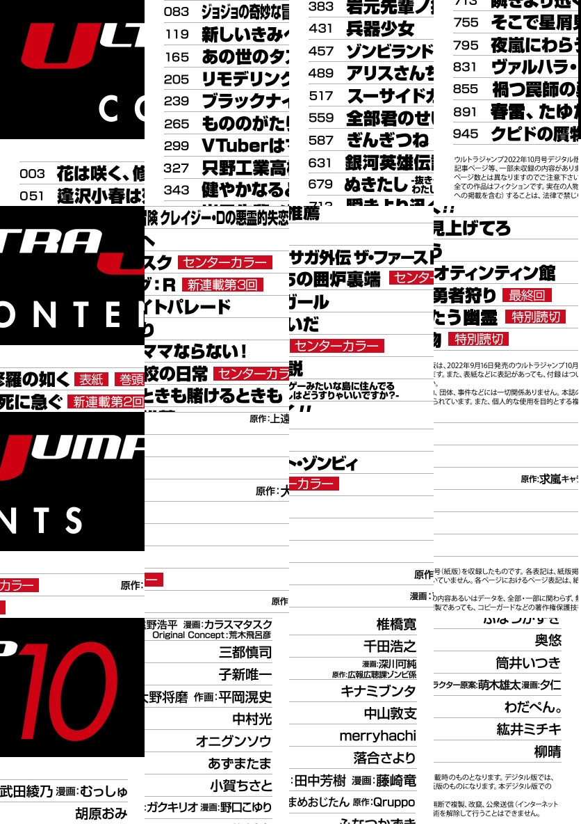 「ウルトラジャンプ 2022年10月号」、紙と同時に配信!/【表紙&巻頭カラー】『花は咲く、修羅の如く』(原作:武田綾乃 漫画:むっしゅ)/【センターカラー】『あの世のタスク』(子新唯一)、『只野工業高校の日常』(小賀ちさと)、『アリスさんちの囲炉裏端』(キナミブンタ)、『ぎんぎつね』(落合さより)/【特別読切】『春雷、たゆたう幽霊』(紘井ミチキ)、『クピドの贋物』(柳晴)/【最終回】『禍つ罠師の勇者狩り』(わだぺん。)/ほか、19作品を掲載!