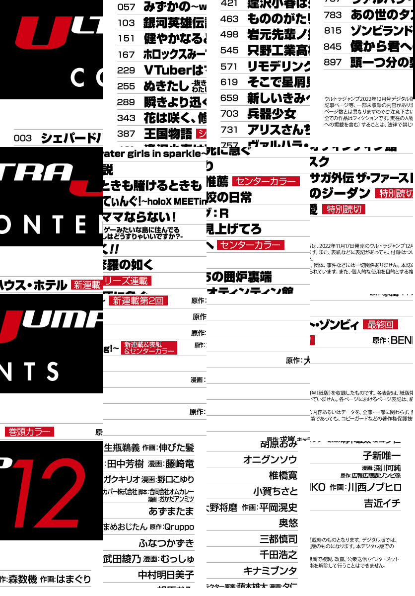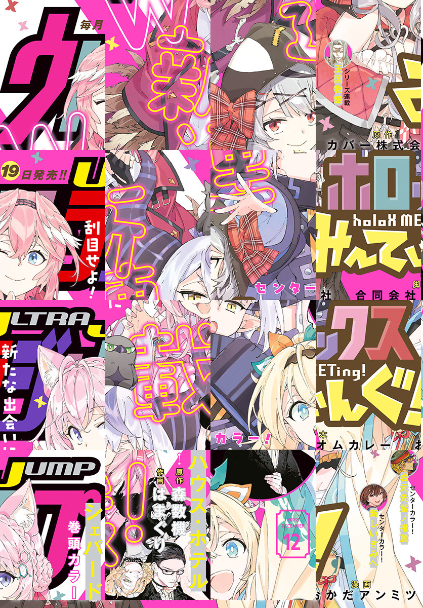 「ウルトラジャンプ 2022年12月号」、紙と同時に配信!/【新連載&表紙&センターカラー】『ホロックスみーてぃんぐ!~holoX MEETing!~』(原作:カバー株式会社 脚本:合同会社オムカレー 漫画:おかだアンミツ)/【新連載&巻頭カラー】『シェパードハウス・ホテル』(原作:森数機 作画:はまぐり)/【センターカラー】『岩元先輩ノ推薦』(椎橋寛)、『新しいきみへ』(三都慎司)/【シリーズ連載】『王国物語』(中村明日美子)/【最終回】『ゾンビランドサガ外伝 ザ・ファースト・ゾンビィ』(漫画:深川可純 原作:広報広聴課ゾンビ係)/【特別読切】『僕から君へのジーダン』(原作:BENIKO 作画:川西ノブヒロ)、『頭一つ分の愛』(吉近イチ)/ほか、16作品を掲載!