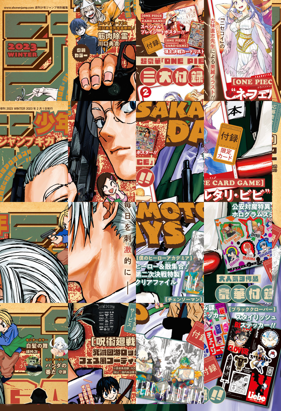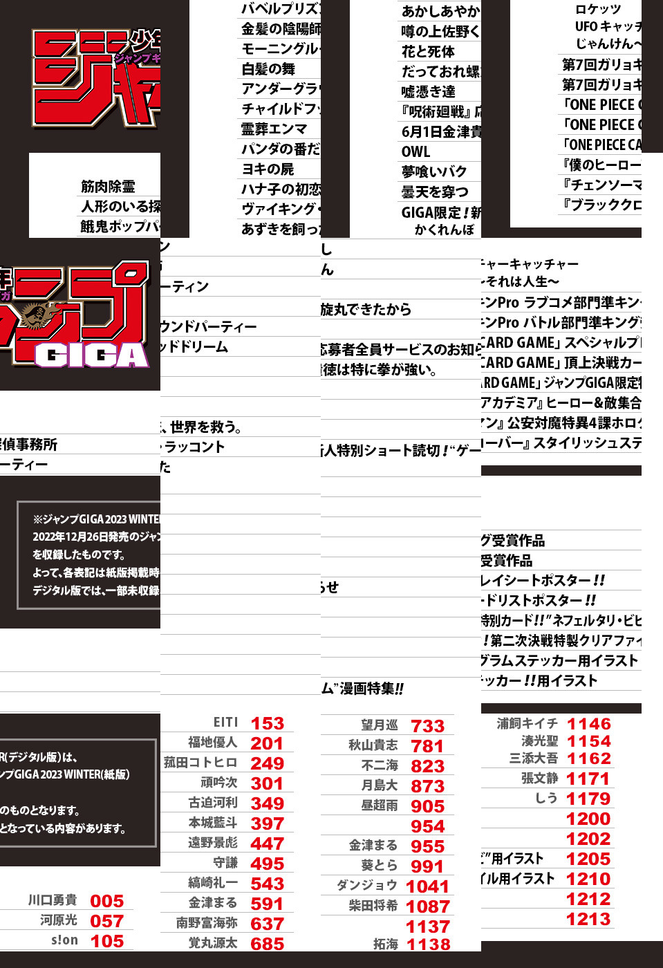 ※「ジャンプGIGA」デジタル版には、紙版の付録は付属しません。応募者全員サービスのご応募はアプリ版の少年ジャンプ+、アプリ版のゼブラックからのみ可能です。ご了承ください。/週刊少年ジャンプ特別編集増刊「ジャンプGIGA 2023 WINTER」、紙と同時に配信!/【巻頭カラー】『筋肉除霊』(川口勇貴)/【センターカラー】『白髪の舞』(頑吟次)、『パンダの番だ』(守謙)/【付録】『僕のヒーローアカデミア』ヒーロー&敵集合! 第二次決戦特製クリアファイル、「ONE PIECE CARD GAME」ジャンプGIGA限定特別カード!! “ネフェルタリ・ビビ”、『チェンソーマン』公安対魔特異4課ホログラムステッカー、『ブラッククローバー』スタイリッシュステッカー!!、「ONE PIECE CARD GAME」スペシャルプレイシートポスター!!、「ONE PIECE CARD GAME」頂上決戦カードリストポスター!!(デジタル版はイラストとして巻末に収録)/ほか、多数の新作読切を掲載!