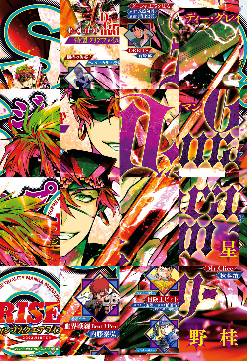 ※「ジャンプSQ. RISE 2023 WINTER」デジタル版には、紙版の付録は付属しません。ご了承ください。/「ジャンプSQ.」増刊「ジャンプSQ. RISE 2023 WINTER」、紙と同時に配信!/【表紙】『D.Gray-man』(星野桂)/【巻頭カラー】『血界戦線 Beat 3 Peat』(内藤泰弘)/【センターカラー】『ダーシャは芯を切る』(原作:八箇句屑 漫画:戸田蛍吾)、『ORBITS』(宮崎郁)、『Mr.Clice』(秋本治)、『冒険王ビィト』(原作:三条陸 漫画:稲田浩司 デザイン協力:中鶴勝祥)/【特別付録】『D.Gray-man』特製クリアファイル(デジタル版はイラストとして巻末に収録)/ほか、11作品を収録!