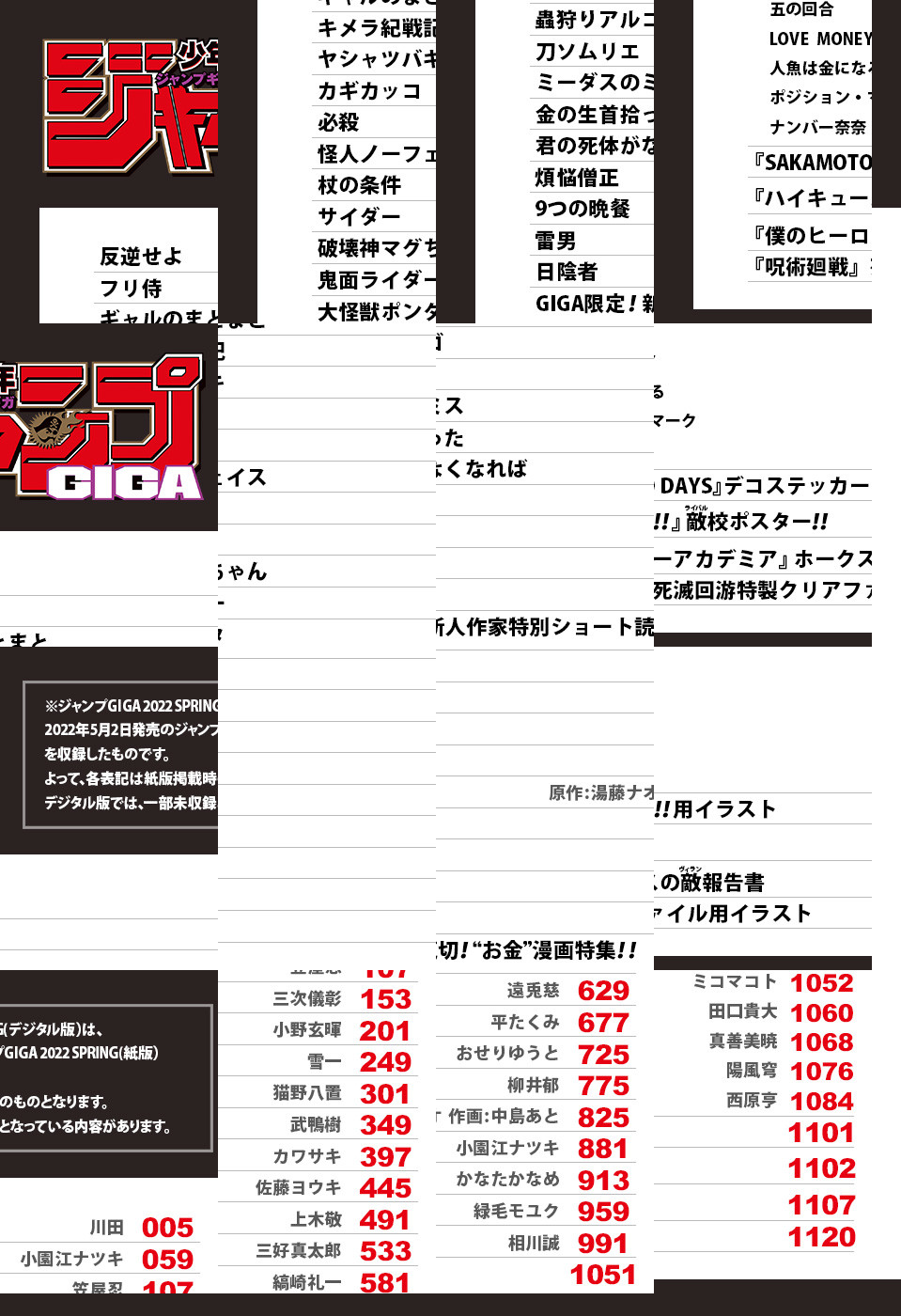 ※「ジャンプGIGA」デジタル版には、紙版の付録は付属しません。ご了承ください。/週刊少年ジャンプ特別編集増刊「ジャンプGIGA 2022 SPRING」、紙と同時に配信!/【巻頭カラー】『反逆せよ』(川田)/【センターカラー】『ヤシャツバキ』(小野玄暉)、『破壊神マグちゃん』(上木敬)/【付録】『呪術廻戦』死滅回游特製クリアファイル、『SAKAMOTO DAYS』デコステッカー!!、『僕のヒーローアカデミア』ホークスの敵報告書、『ハイキュー!!』敵校ポスター!!(デジタル版はイラストとして巻末に収録)/ほか、多数の新作読切を掲載!