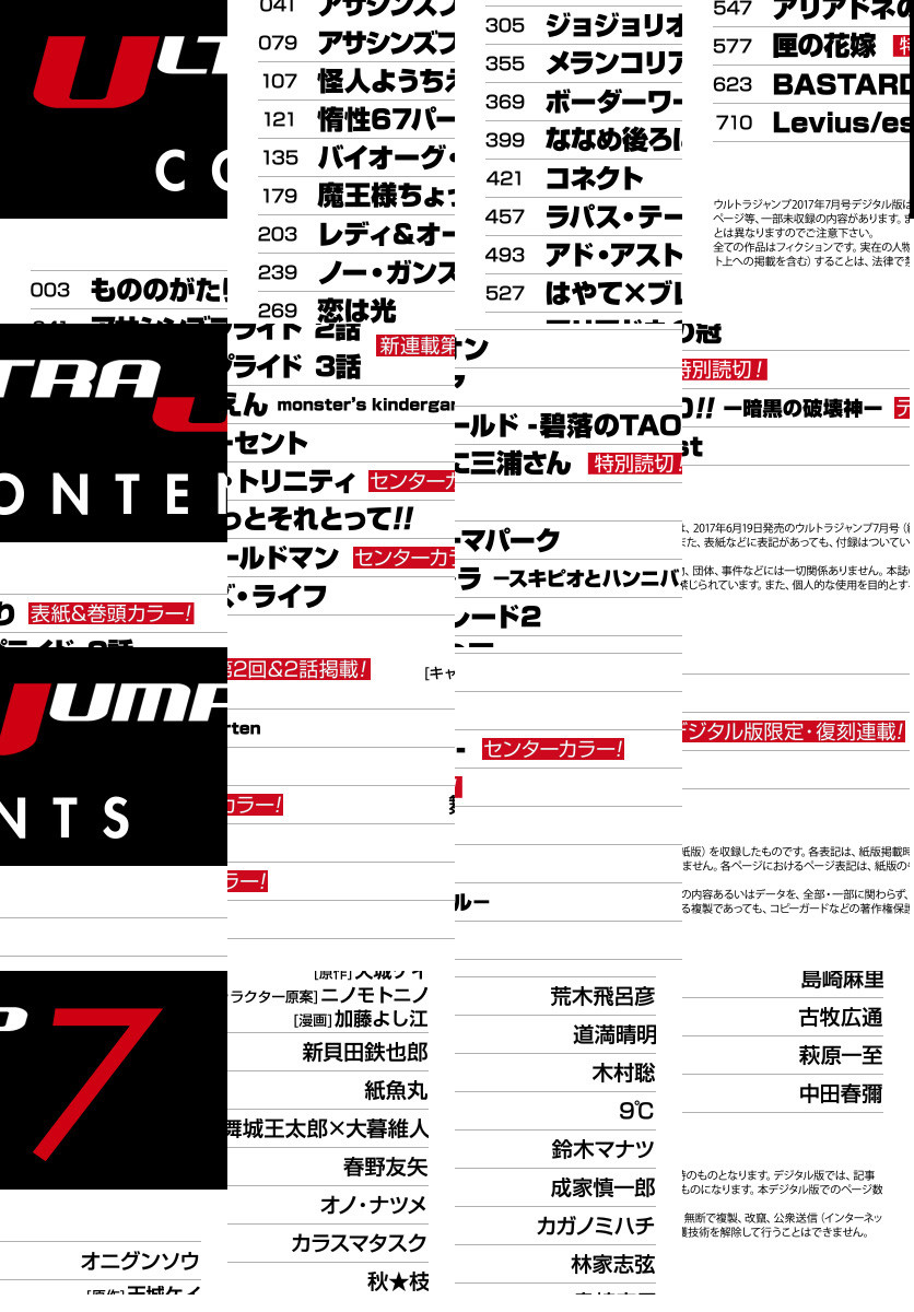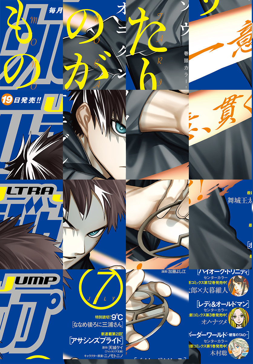 ●表紙&巻頭カラー! 復讐の原点・唐傘の出現と京都三大付喪神・雅楽寮の裏切り。孤立無援の状況で兵馬はぼたんを守れるか!? 『もののがたり』(オニグンソウ) ●新連載第2回は、一挙2話掲載! “暗殺教師”クーファと“無能才女”メリダの命がけのレッスン、いよいよスタート! 『アサシンズプライド』(天城ケイ×加藤よし江) ●センターカラー! 実世界で肉体を得たデータ生命体・タオ。彼を巡り、ZONEとZEINの争いはさらに加速する! コミックス1巻配信は7月19日! 『ボーダーワールド -碧落のTAO-』(木村聡) ●コミックス新刊の配信を7月19日に控える2作品がセンターカラーで登場! 『レディ&オールドマン』(オノ・ナツメ)&『バイオーグ・トリニティ』(舞城王太郎×大暮維人) ●2人の俊英による特別読切! 『ななめ後ろに三浦さん』(9℃)&第4回ウルトラコミック大賞・佳作獲得の『匣の花嫁』(古牧広通) ●デジタル版限定・復刻連載! 『BASTARD!! —暗黒の破壊神—』(萩原一至)他 ※「ウルトラジャンプ」デジタル版には、紙版の付録は付属しません。ご了承ください。