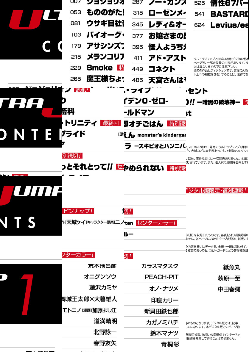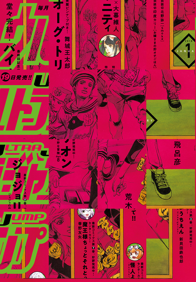 ●表紙&巻頭カラーで、その生き様を心に刻め! 東方家で起きる予想外の出来事…新たな敵のスタンドの正体は!? ジョジョの奇妙な冒険 第8部『ジョジョリオン』(荒木飛呂彦) ●あるべき姿を取り戻した世界。藤井たちの恋心はどんな結末を迎えるのか!? 必見の最終回!! 『バイオーグ・トリニティ』(舞城王太郎×大暮維人) ●魔王様この生活に毒されてきてません…? 偉大なる魔王様の無駄遣いをセンターカラーでお届け! 『魔王様ちょっとそれとって!!』(春野友矢) ●かわいらしい怪人エンジたちの、すくすく成長絵日記がセンターカラーで登場! 『怪人ようちえん monster's kindergarten』(新貝田鉄也郎) ●タクシーの運転手と、大金を手に入れた訳あり小学生…2人が向かう先は? 特別読切『Smoke』(北野詠一) ●特別読切! 天然箱入りお嬢さま、禁断のデブ飯を初体験…! 『お嬢さまの即オチごはん』(印度カリー) ●デジタル版限定・復刻連載! 『BASTARD!! —暗黒の破壊神—』(萩原一至)他 ※「ウルトラジャンプ」デジタル版には、紙版の付録は付属しません。ご了承ください。